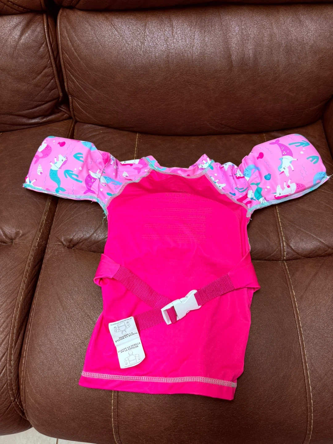 This SwimWays swim vest features a fun mermaid design. It's designed to help children learn to swim. The adjustable strap and buckle ensure a secure fit.