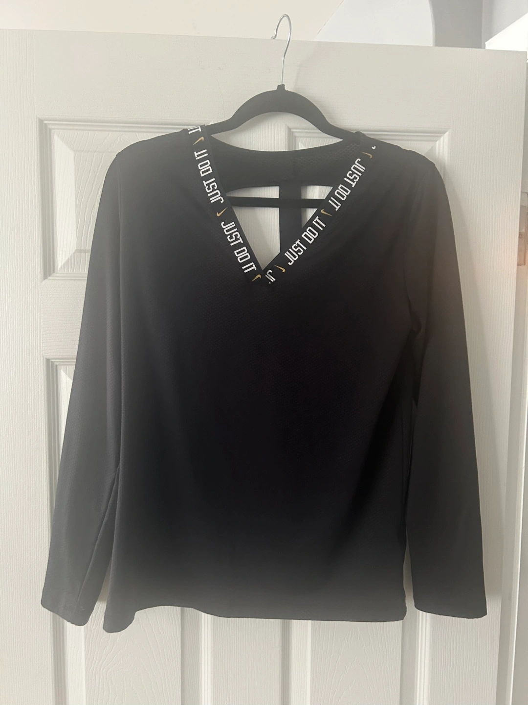 Black Nike long sleeve workout top. Cut-out back detail. Features ‘Just Do It’ branding. Mesh for breathability. Great for layering or wearing alone.no snags, rips or stains.