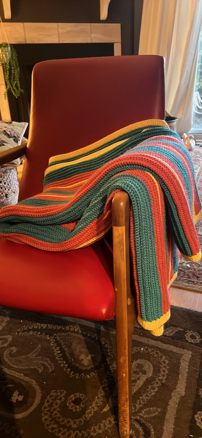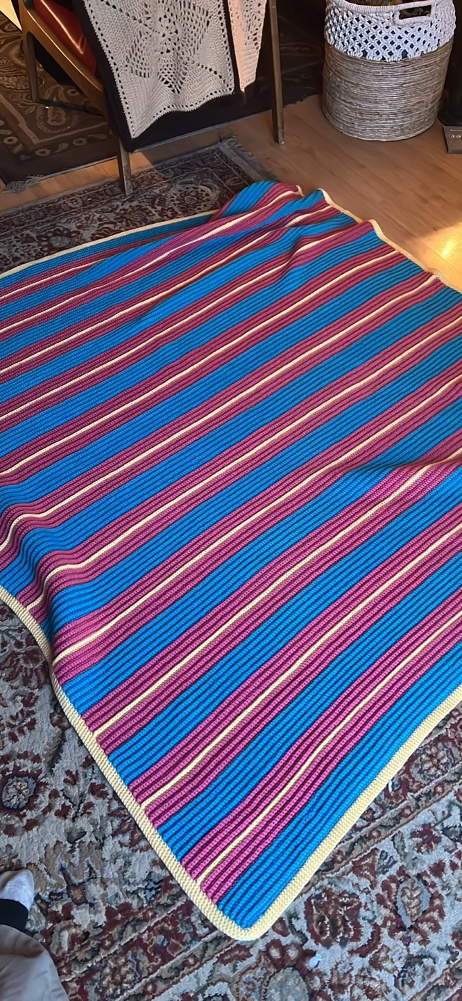 Cozy hand-knitted throw blanket. Features a vibrant striped pattern in teal, pink, and yellow. Perfect for adding a pop of colour to your living space. Excellent condition. The picture on the chair is more true to the color 72x56 (large)