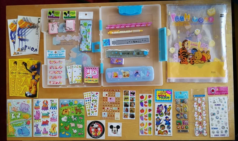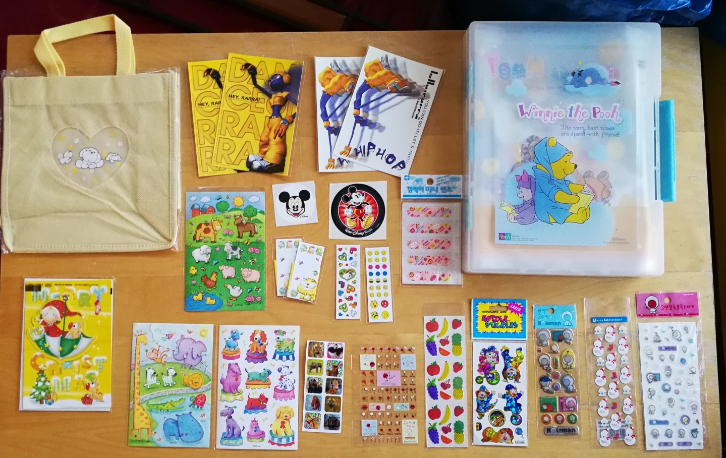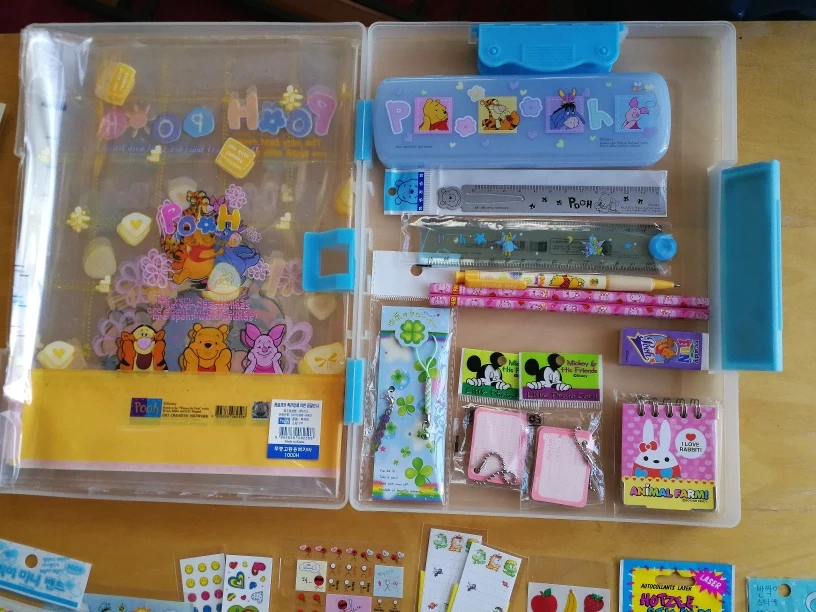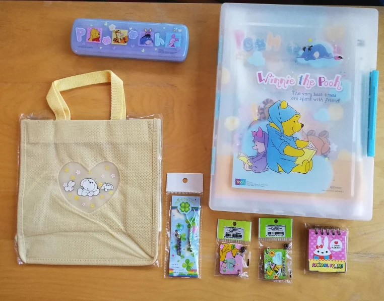 1000+Large Winnie the Pooh themed stationery carrying case, includes pencil case, pencils, eraser, 2 rulers, pack of plastic covers, post cards, mini notepad, love dog bag, little photo cards decor, 4 leaf clover decor and various stickers pick up in downtown close to St Patrick station, Dundas-University area or Yonge-Bloor on some evenings