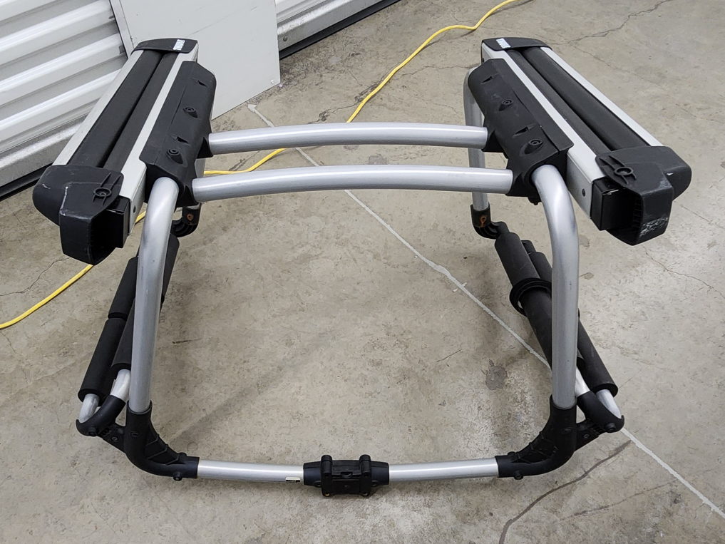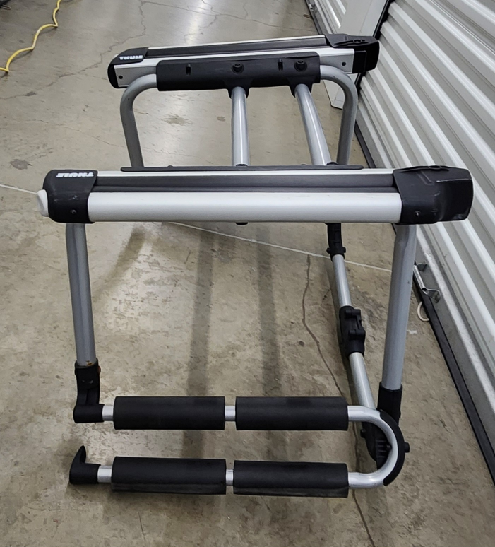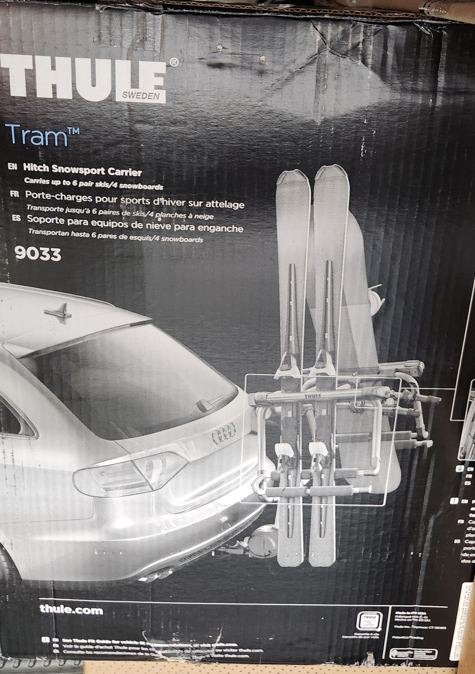 Thule Tram hitch-mounted ski and snowboard carrier. Carries up to 6 pairs of skis or 4 snowboards. Aluminum construction. Excellent condition. Model 9033.