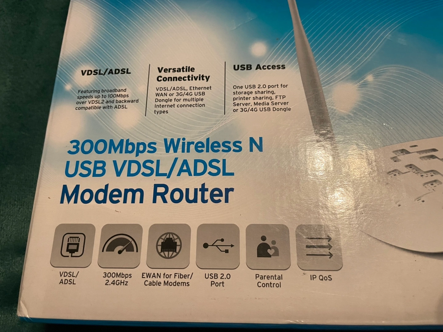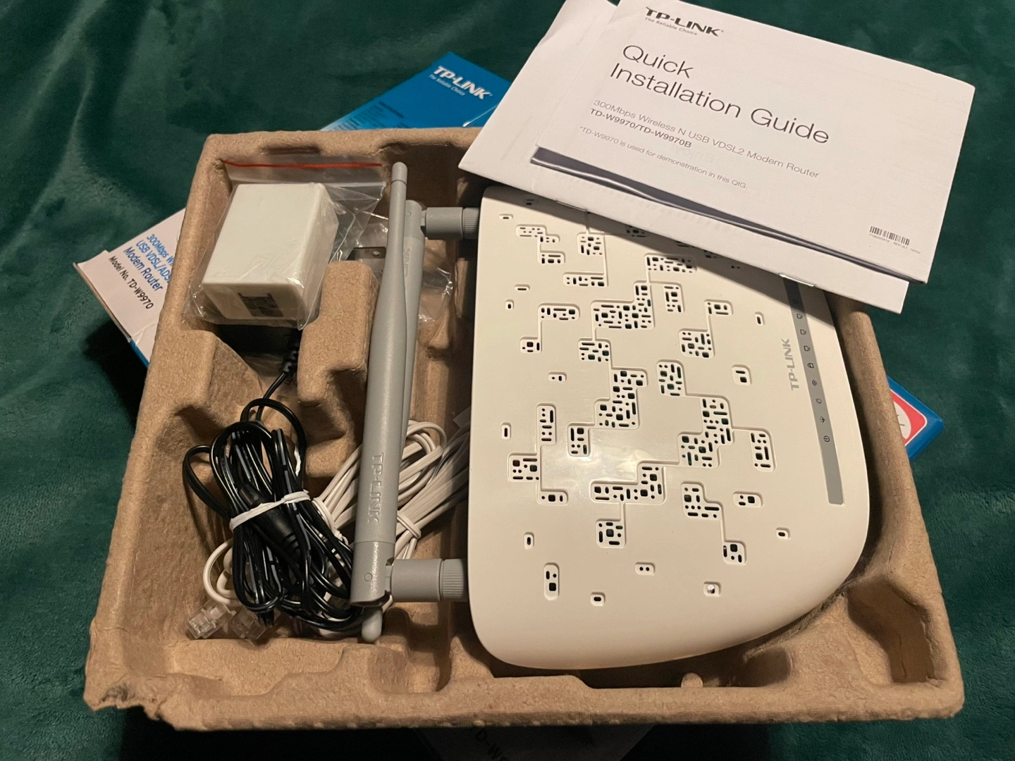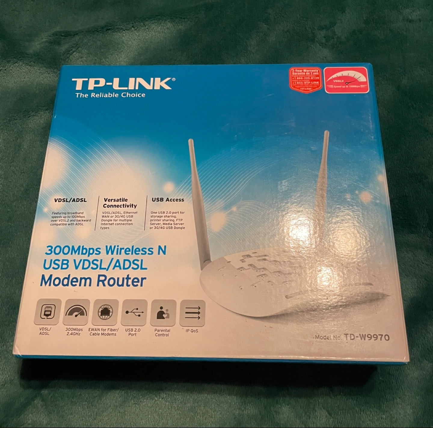 711New, never used, open box. Husband purchased the wrong item and missed the return window. TP-Link 300Mbps Wireless N USB VDSL/ADSL Modem Router. Model: TD-W9970. Includes modem, power adapter, cables, and instruction manual. Versatile connectivity, USB access, parental controls, and IP QoS. Pick up from a smoke free home near Browns Line & Lakeshore Boulevard in Etobicoke (Toronto/Mississauga).