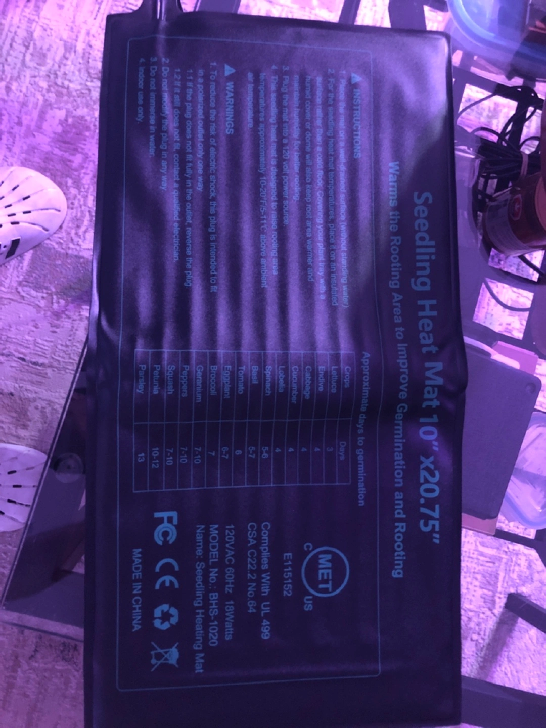 Seedling heat mat, warms the rooting area to improve germination and rooting. Model No. BRHS-1020. Made in China. Includes power cord.