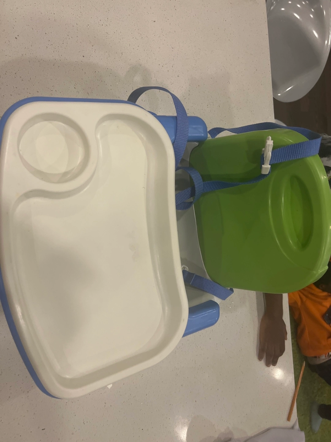 Portable booster seat. Features adjustable straps and removable tray. Great for travel and dining.