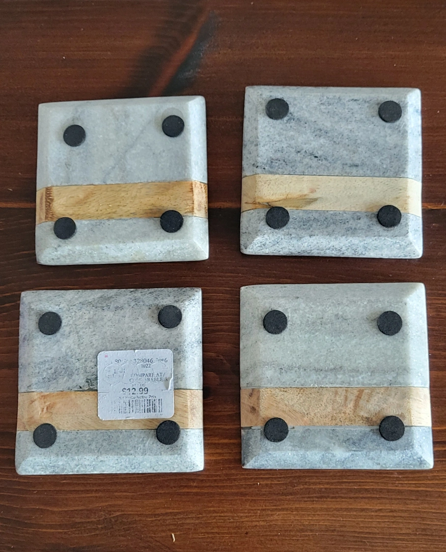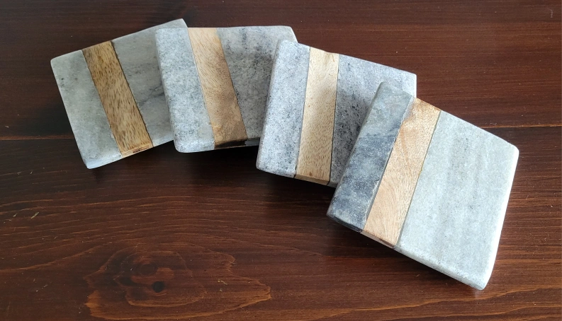Four square marble coasters. Grey marble with light brown wood inlay. Rubber stoppers on the bottom. Great for protecting furniture.