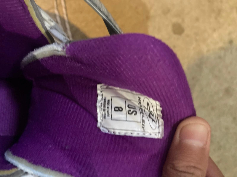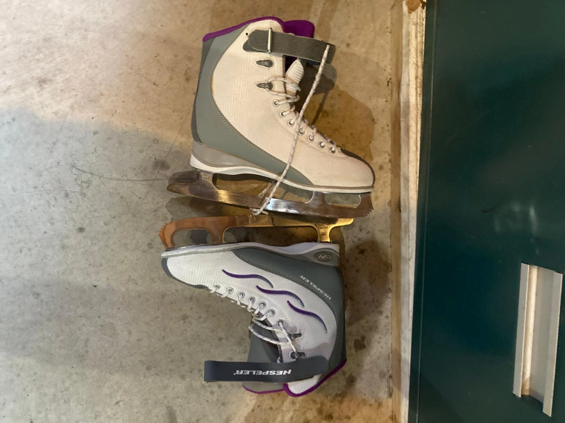 Pair of used figure skates. White and grey with purple accents. Size 8 US. Good condition perfect for this time of the year.