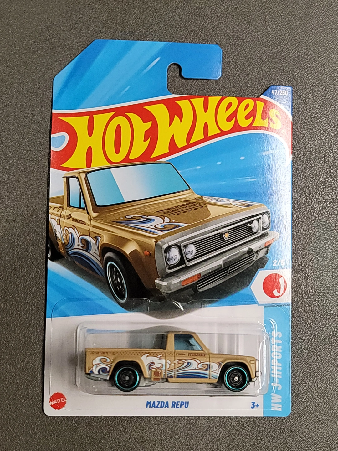 39Collectible diecast Hot Wheels car. Mazda Repu model. Gold with blue wave design. Numbered 47/250. Part of the HW J-Imports series.