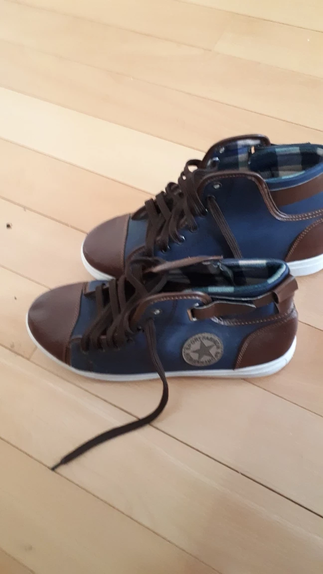Pair of navy blue and brown high-top sneakers. Brown leather accents. Lace-up closure. Plaid inner lining. Comfortable casual wear.