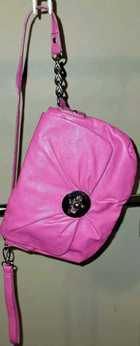 Stylish hot pink crossbody bag and clutch. Features a chain and leather strap. Zipper closure. Interior zipper pocket and slip pockets. Great for everyday use.