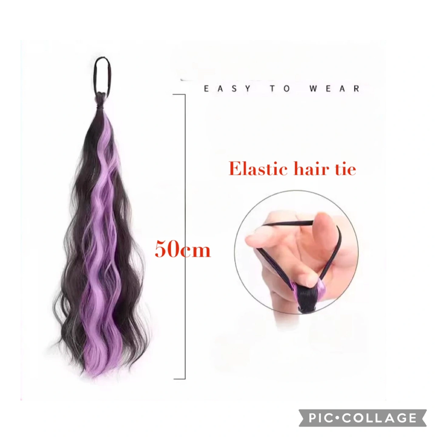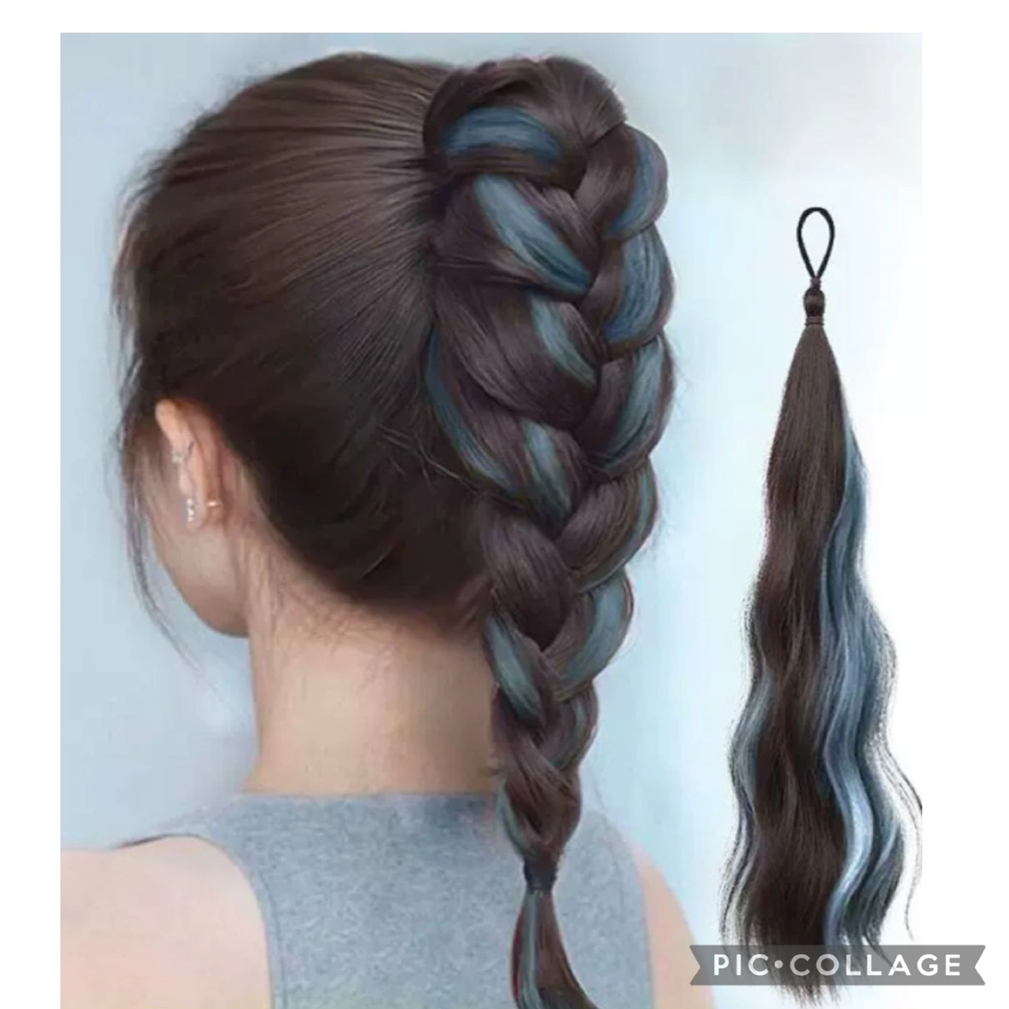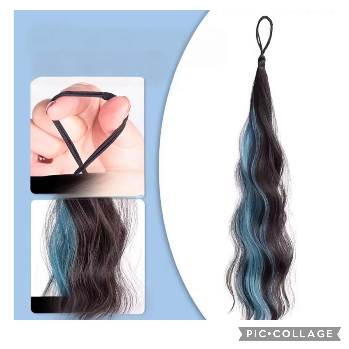 50cm long clip-in ponytail extension. Features dark brown hair with blue highlights. Elastic hair tie for easy attachment. Adds volume and colour.