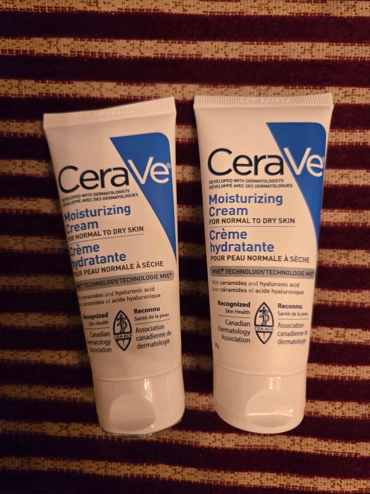 Two tubes of CeraVe moisturizing cream for normal to dry skin. Contains ceramides and hyaluronic acid. Developed with dermatologists.