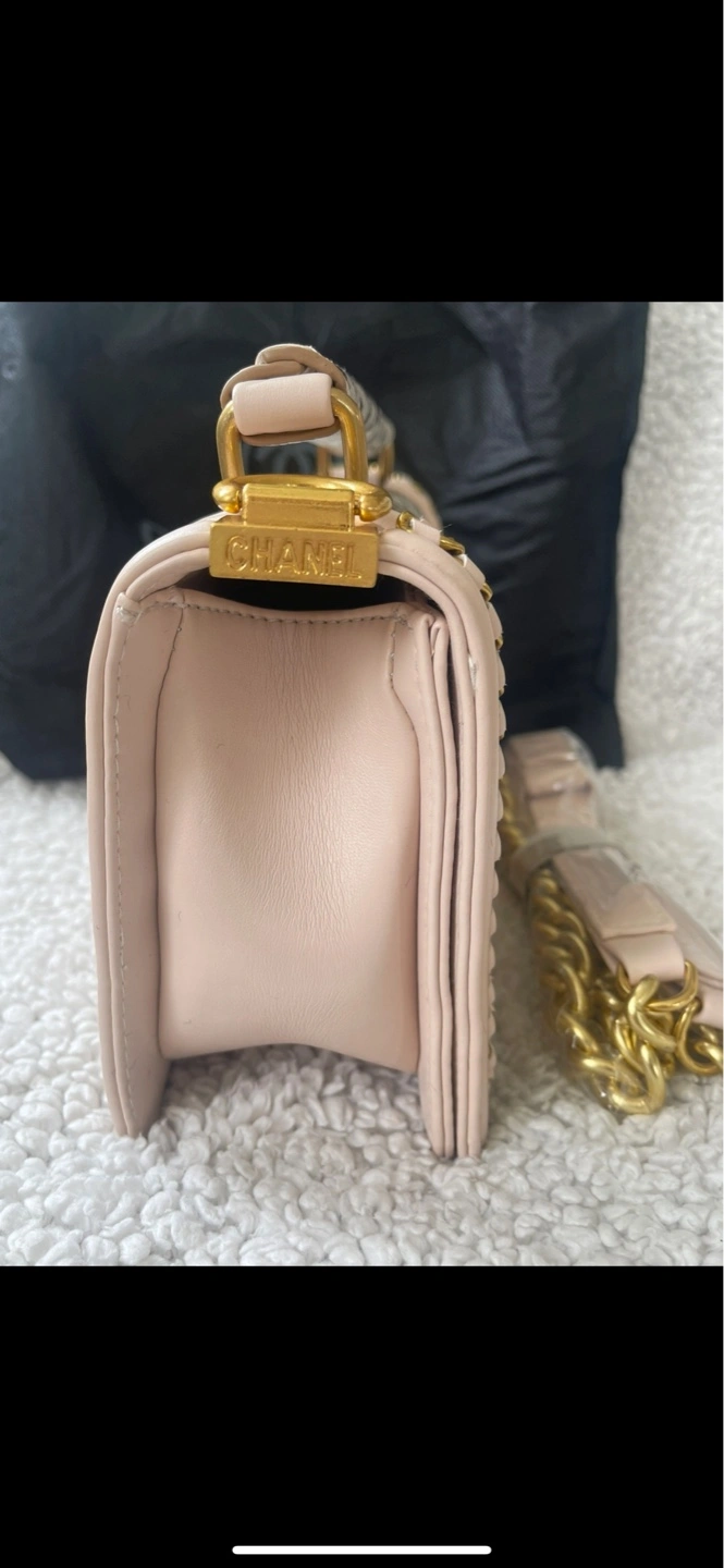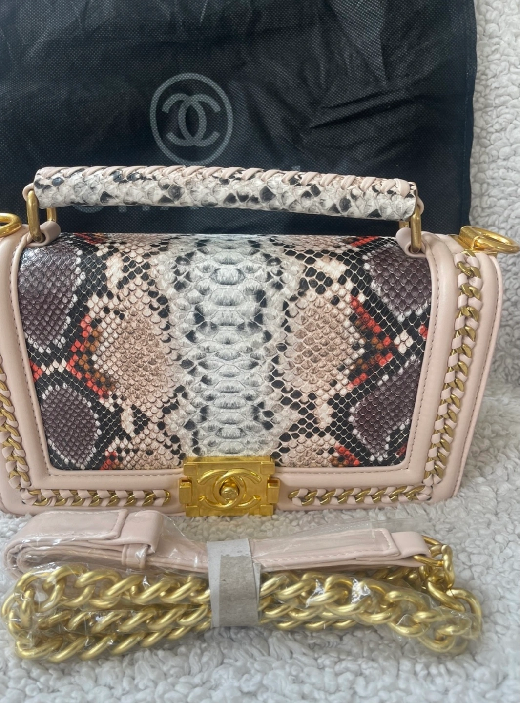 Gorgeous snakeskin-embossed handbag. Features gold chain strap and top handle. Comes with dust bag. Excellent condition.