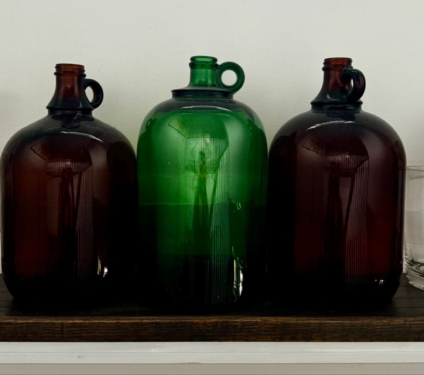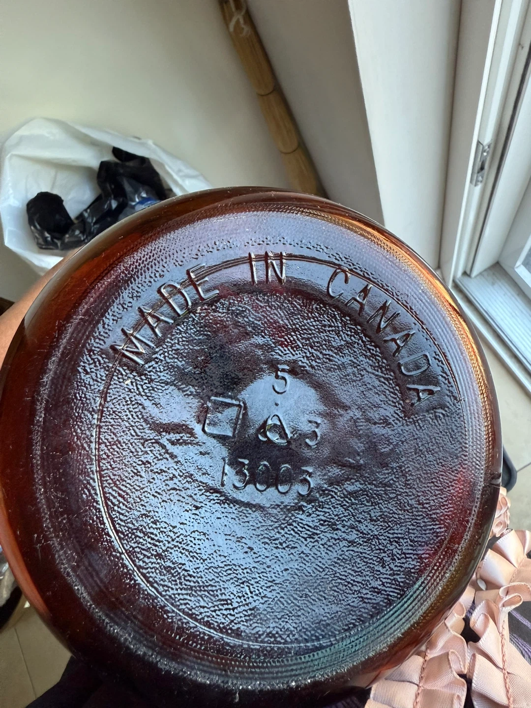 Vintage amber and green glass jug. Made in Canada and holds about 5 litres.