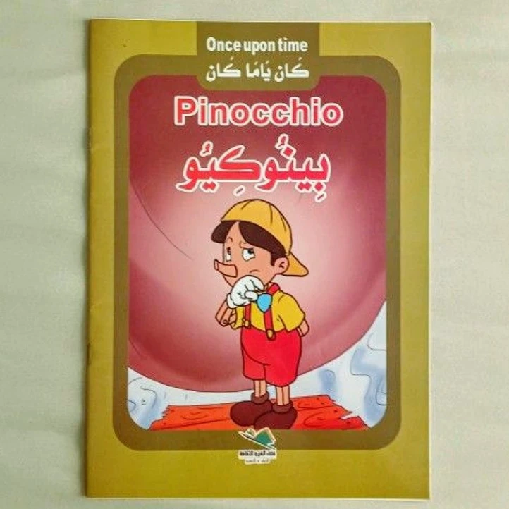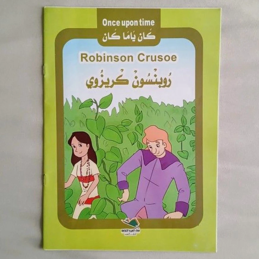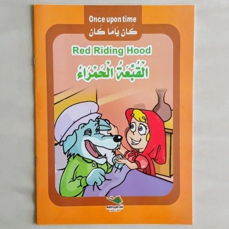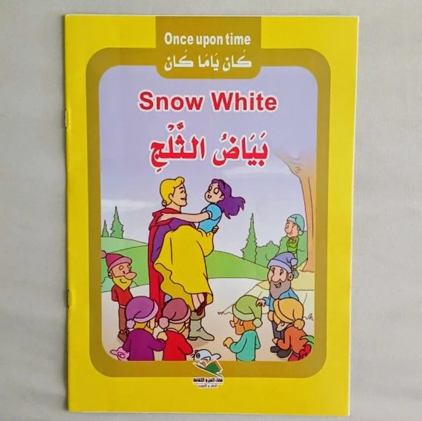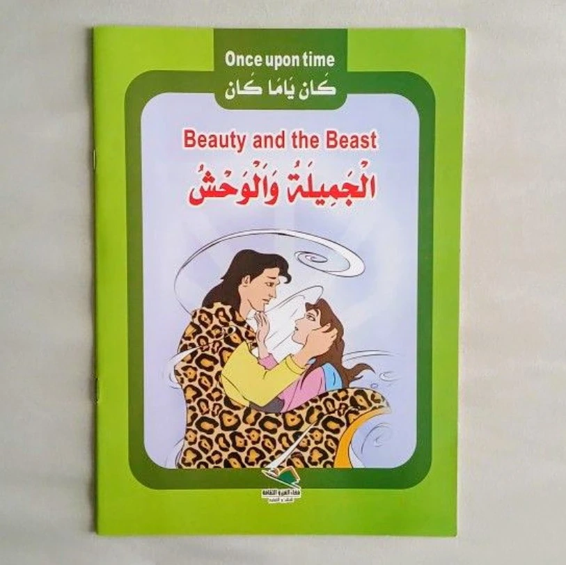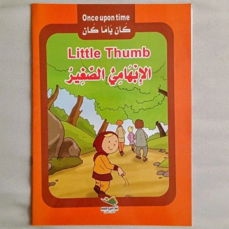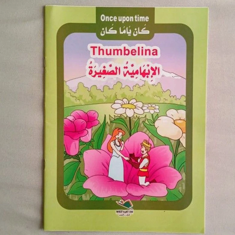 Five small paperback books. Each features a classic fairytale. Stories include Thumbelina, Beauty and the Beast, Snow White, Robinson Crusoe, and Red Riding Hood. Arabic and English text. Geared towards young children.