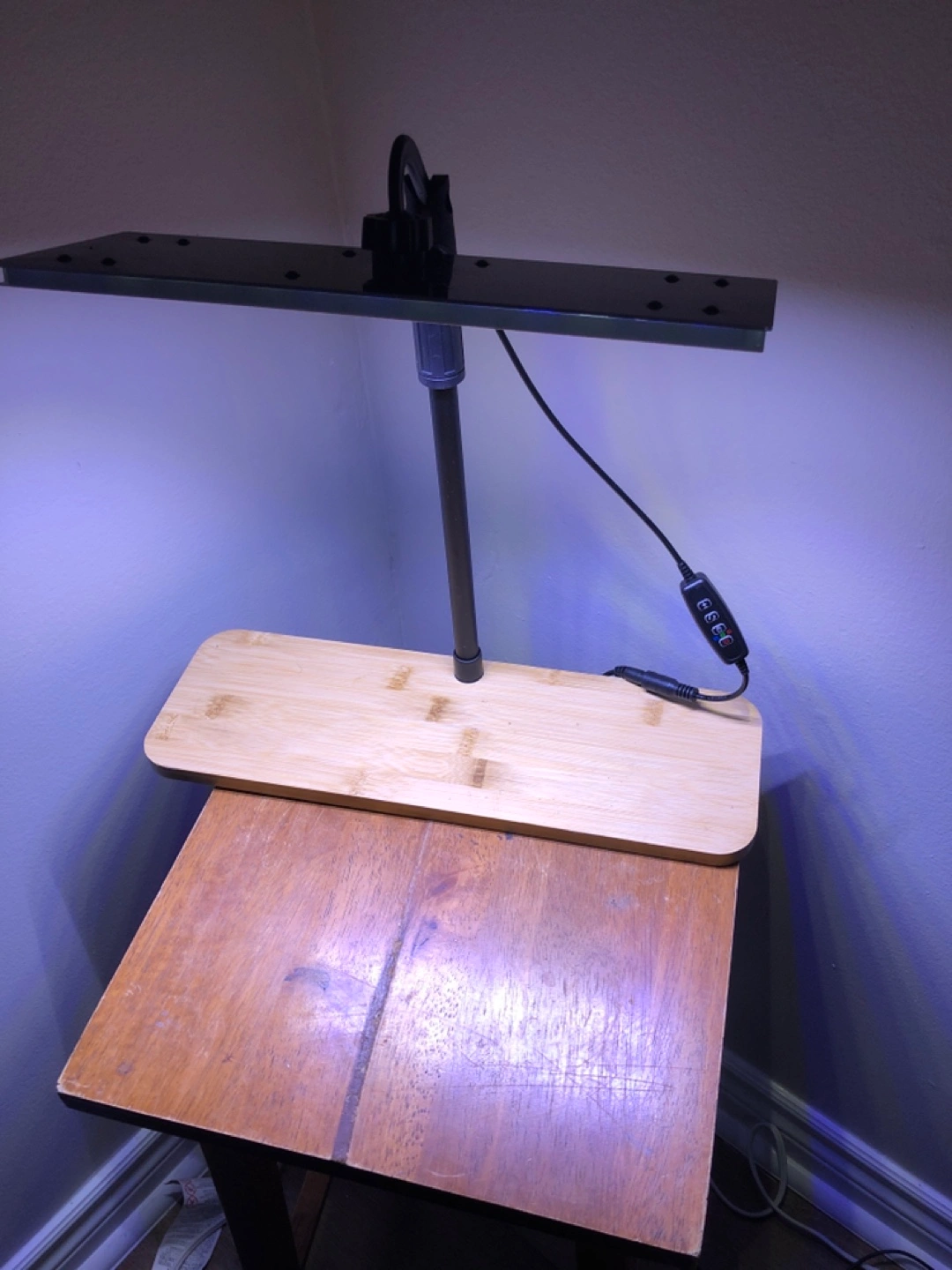 Full-spectrum LED grow light. Adjustable gooseneck stand. Bamboo base. Includes power supply and dimmer switch. Perfect for plants.
