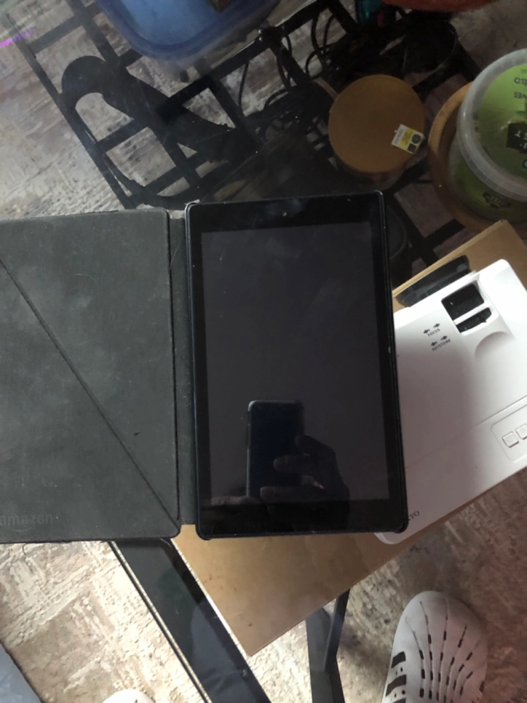 Used Amazon Kindle Fire HD 8 tablet. Includes a grey fabric case. Shows some wear.
