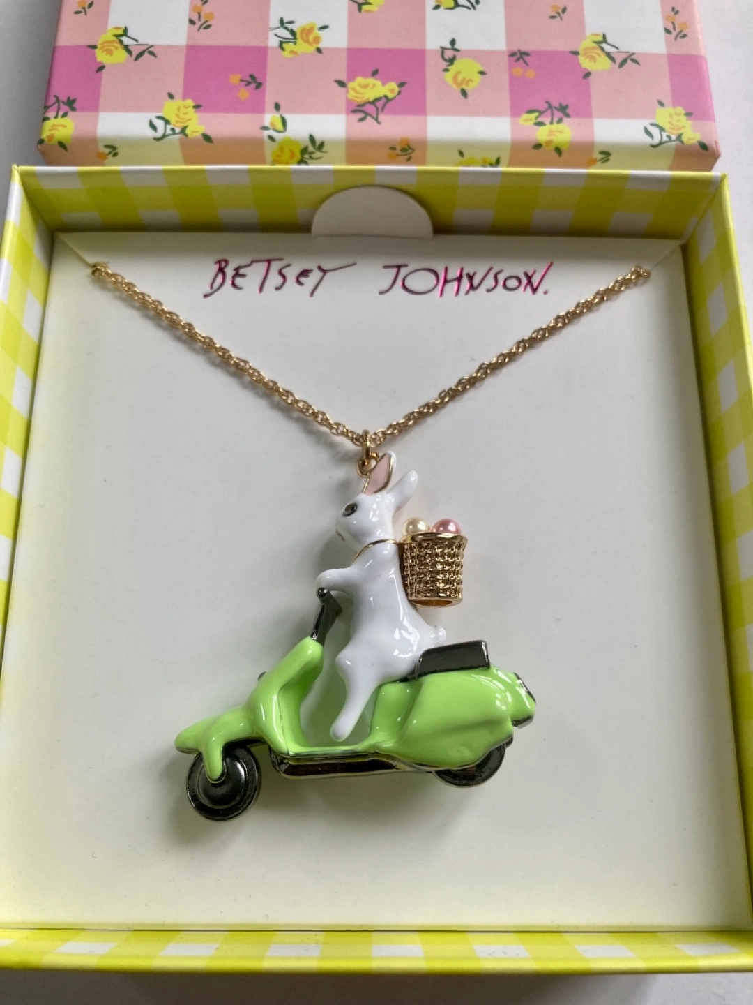 Adorable necklace. Features a white bunny riding a lime green scooter. Gold chain. Comes in original box.