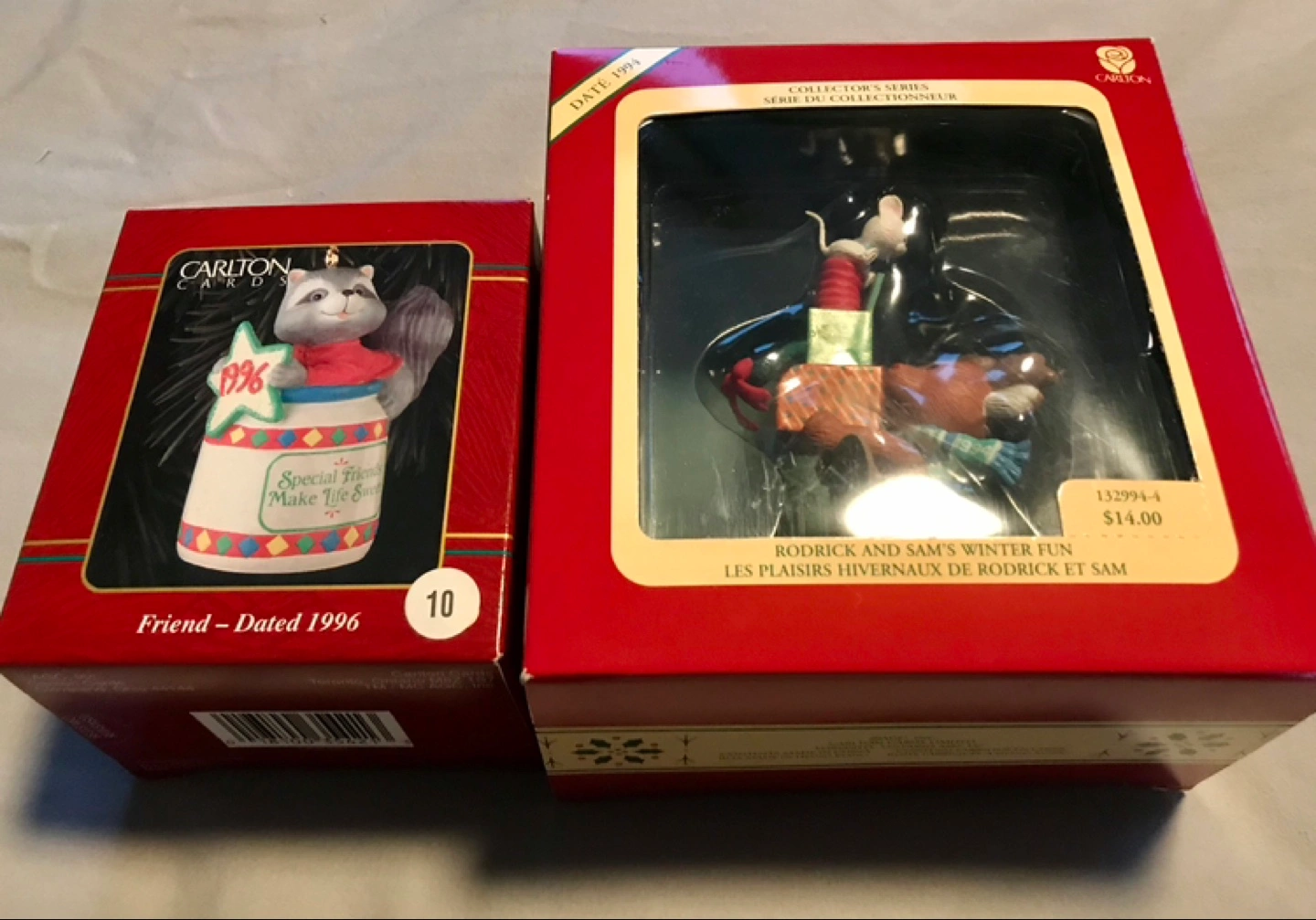 150Two vintage Carlton Cards Christmas Heirloom Collection ornaments. One features a raccoon holding a star, dated 1996. The other depicts Rodrick and Sam enjoying winter fun, 1994.