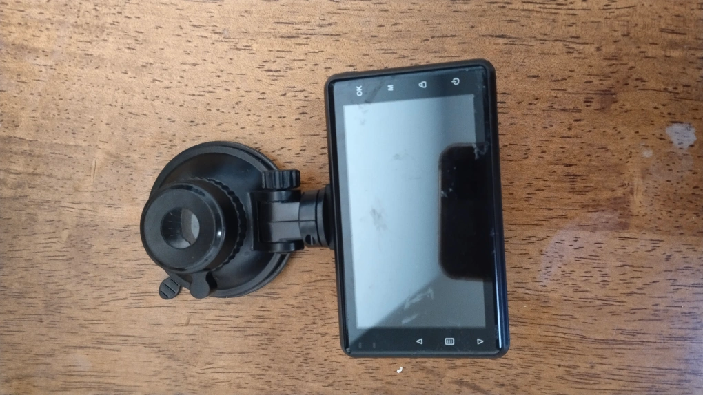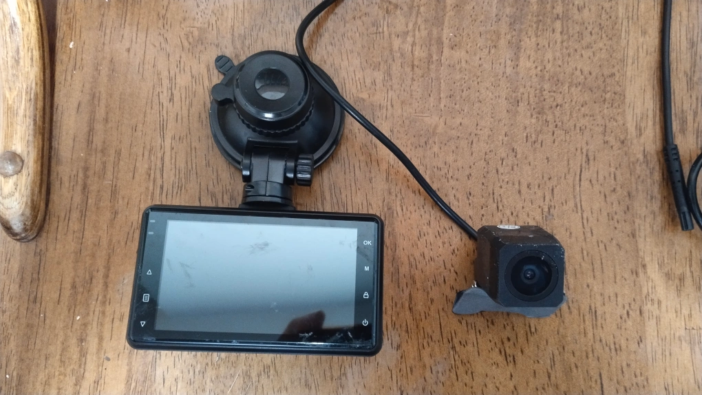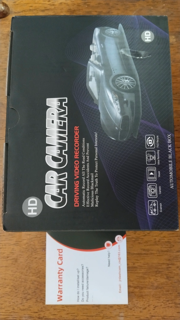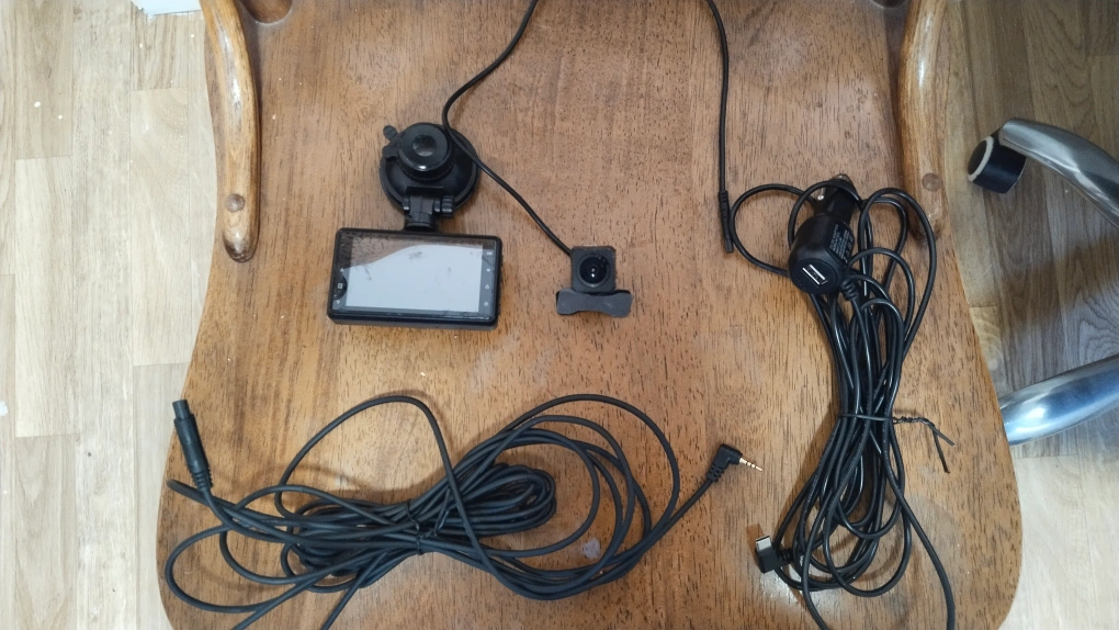 Full HD dash cam system. Includes main unit, rear camera, power cables, and mounting hardware. Micro SD card reader included.