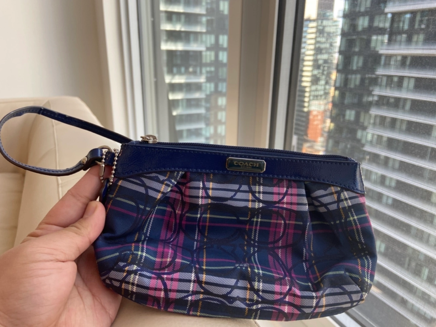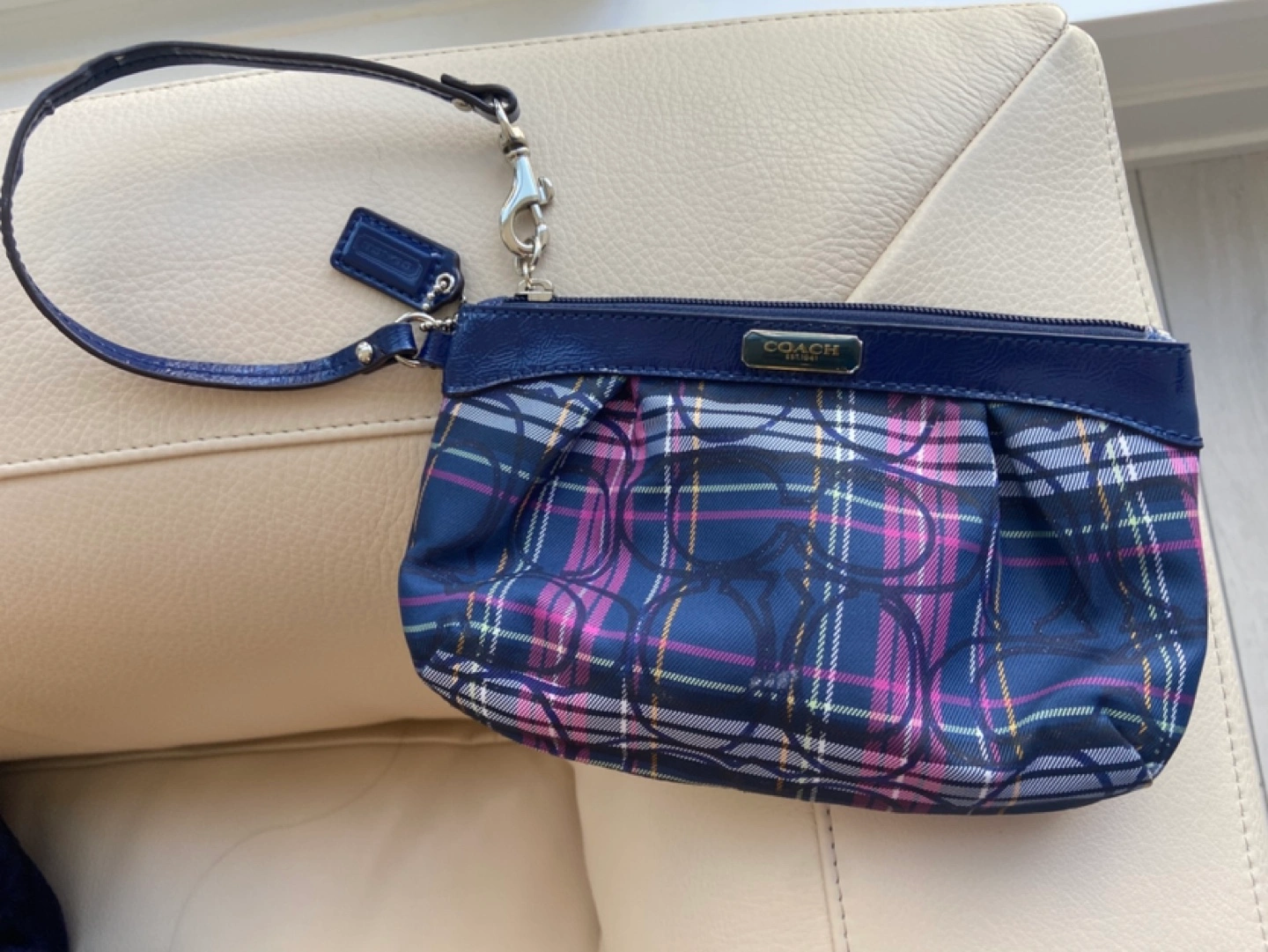 Small Coach wristlet. Blue and pink plaid print. Features a wrist strap and zip closure. Compact size, perfect for essentials.