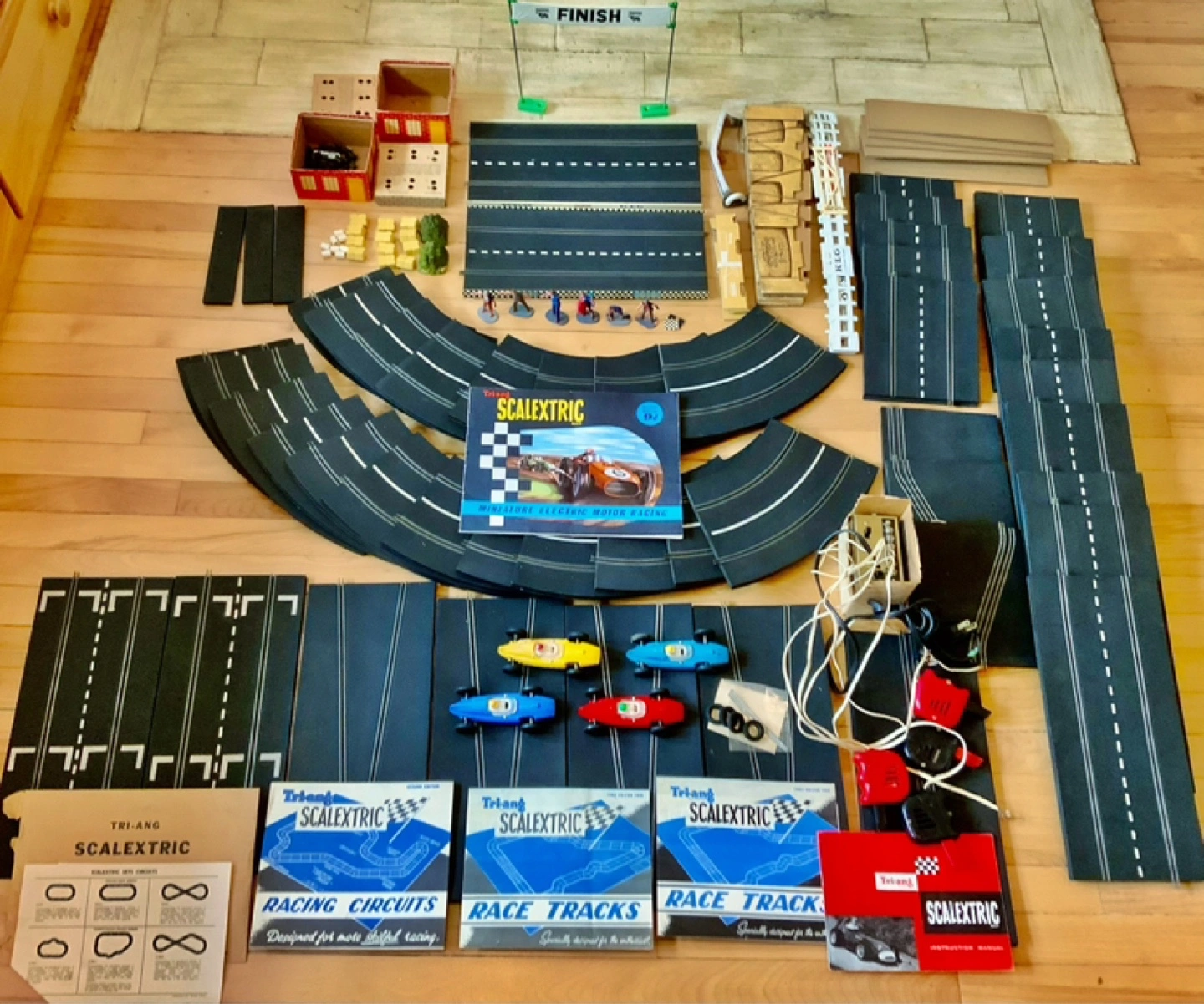 ⭐️VERY LARGE COMPLETE SET including everything in photographs ….several track layout booklets,original instruction manuals,original 2nd edition very RARE SCALEXTRIC catalogue ,several track accessories and figures,hay bails,etc,etc.