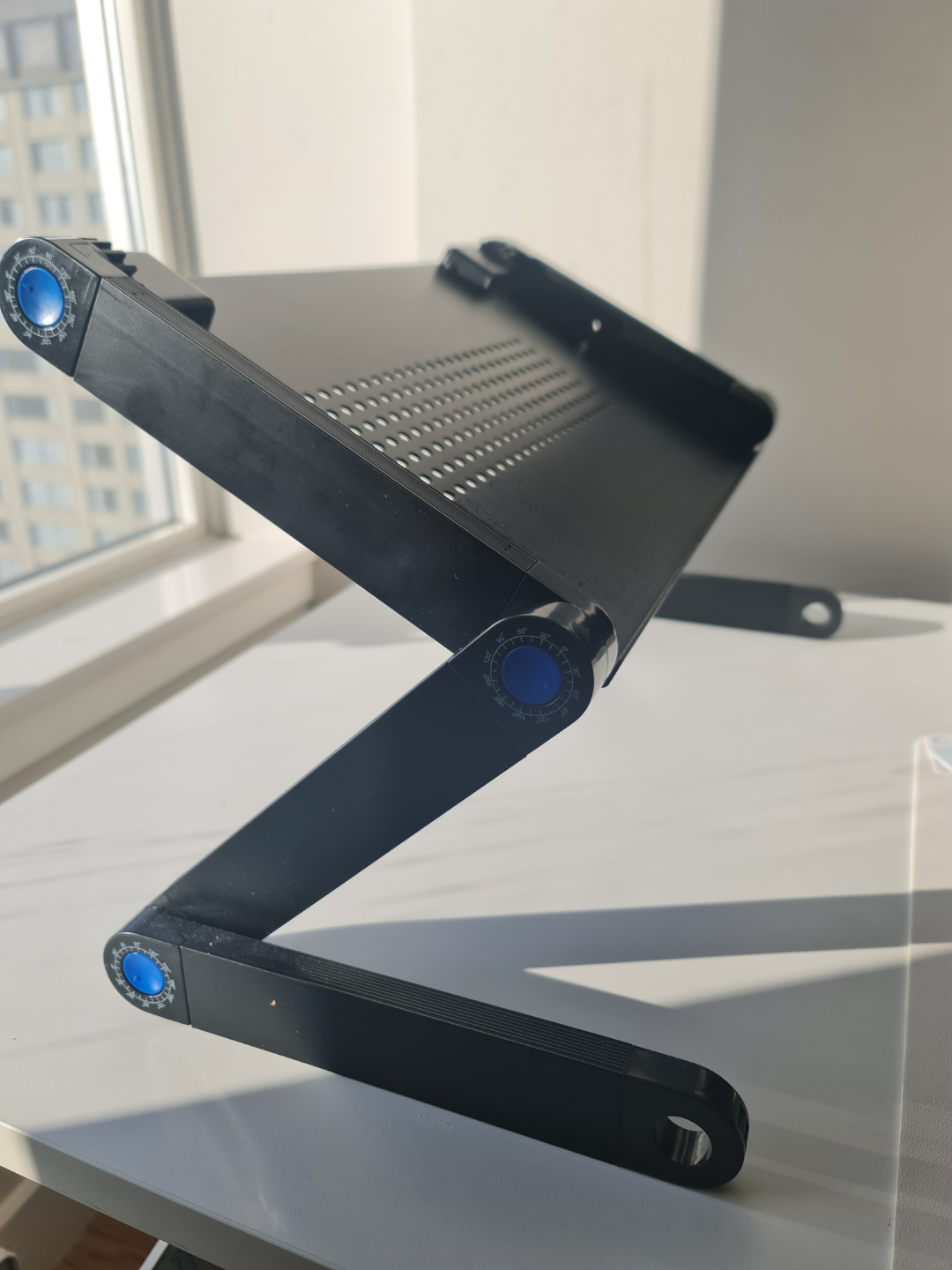 Black metal laptop stand. Foldable design. Multiple adjustable height settings. Great for working from home or on the go. Lightweight and portable.