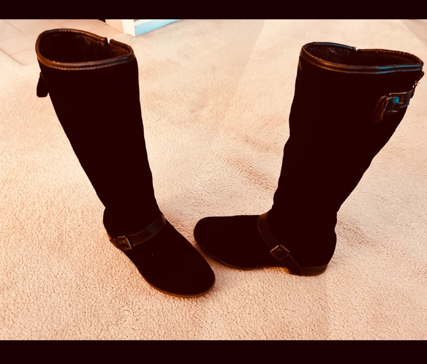 Brown suede leather knee-high boots with a buckle detail. Zipper closures .