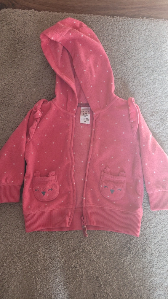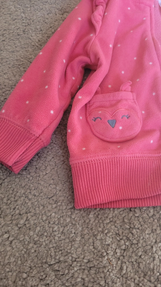365Adorable pink zip-up hoodie. Features a cute owl design. Soft fleece material.