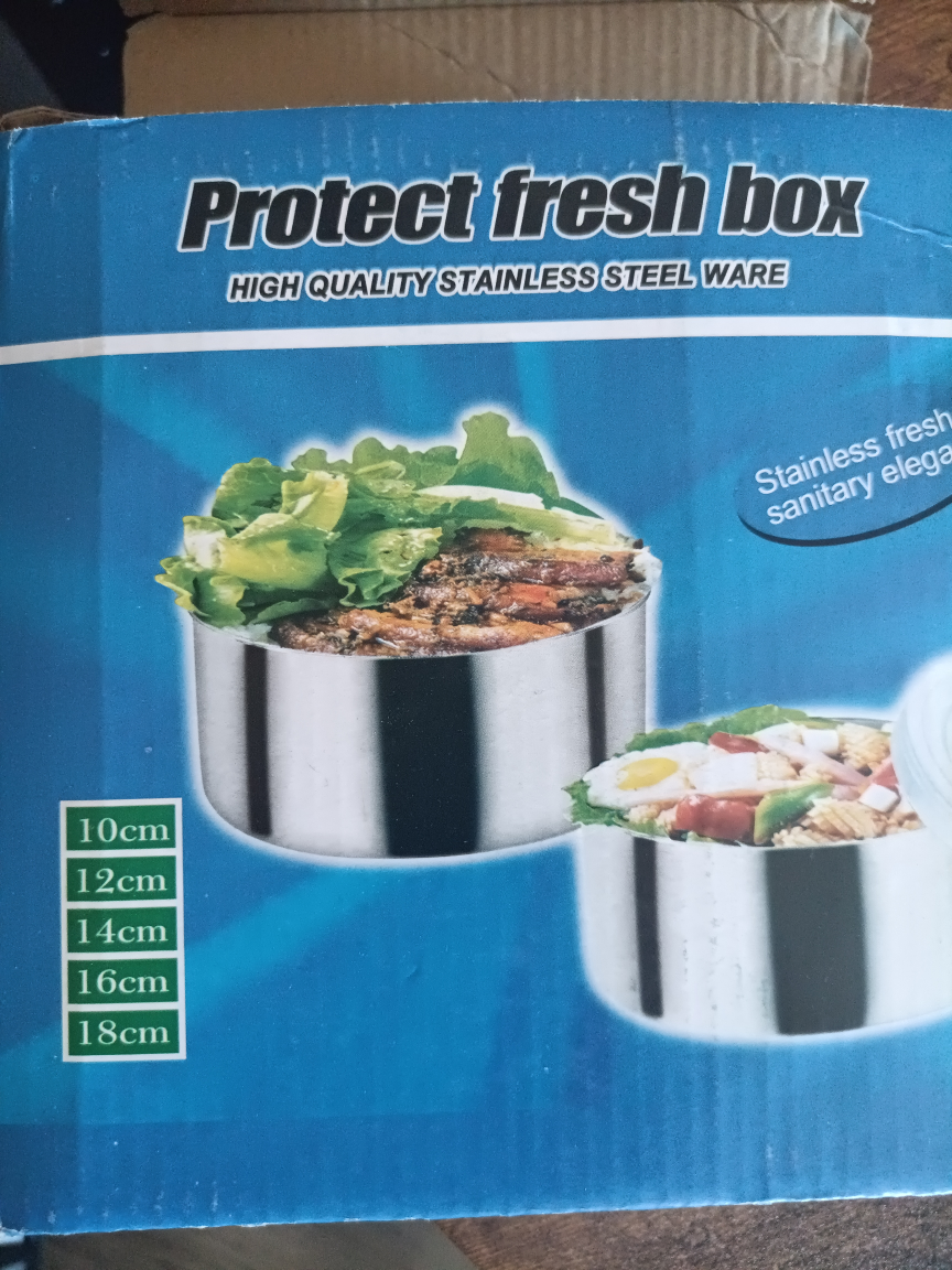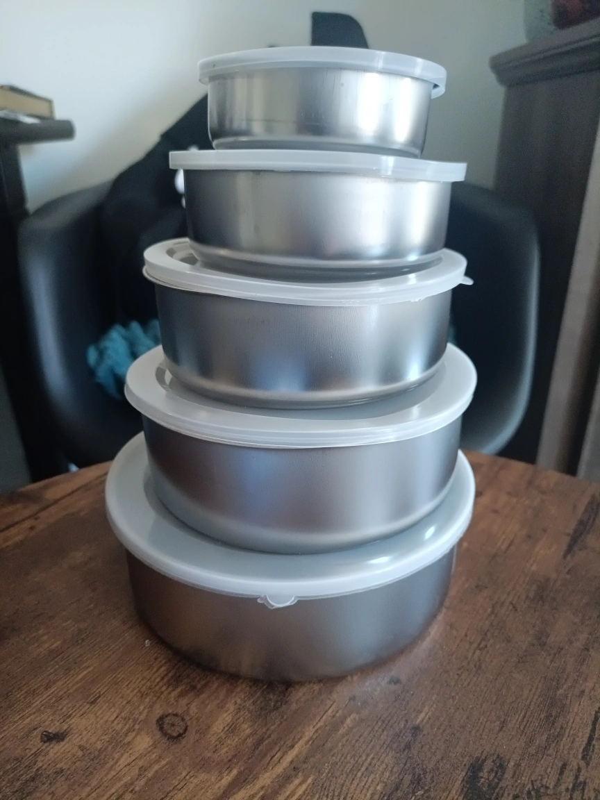 Set of five stainless steel food containers. Various sizes. Great for leftovers or meal prepping. Includes lids.