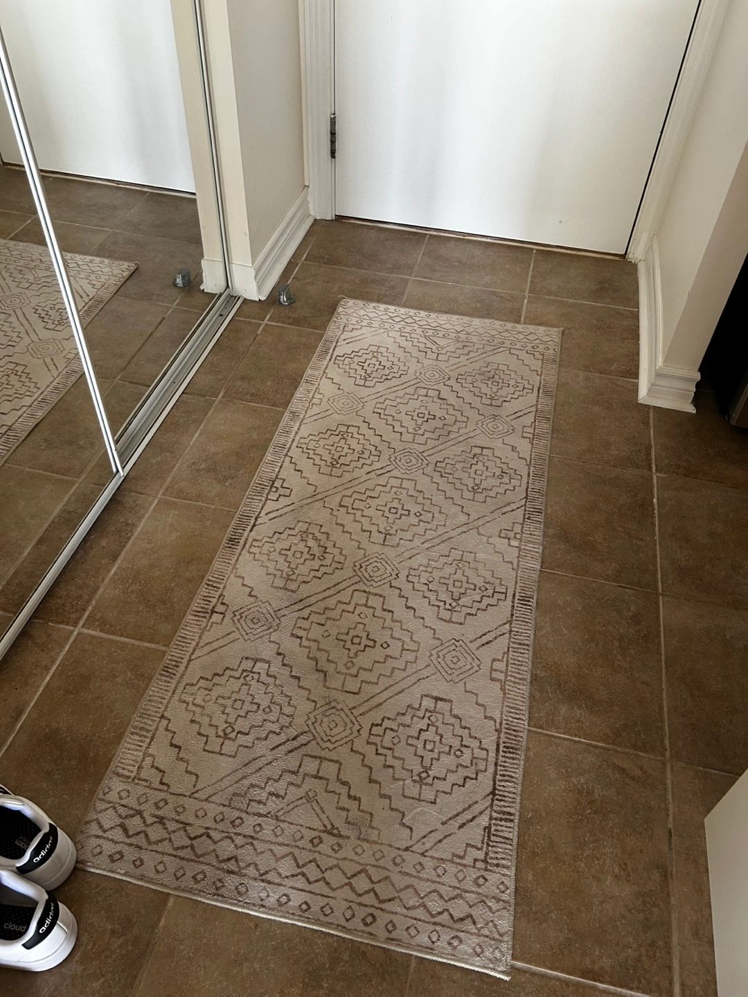 Cream coloured runner rug. Geometric pattern. Perfect for entryway or hallway. Lightweight and easy to clean.