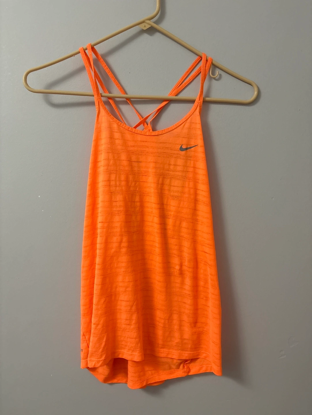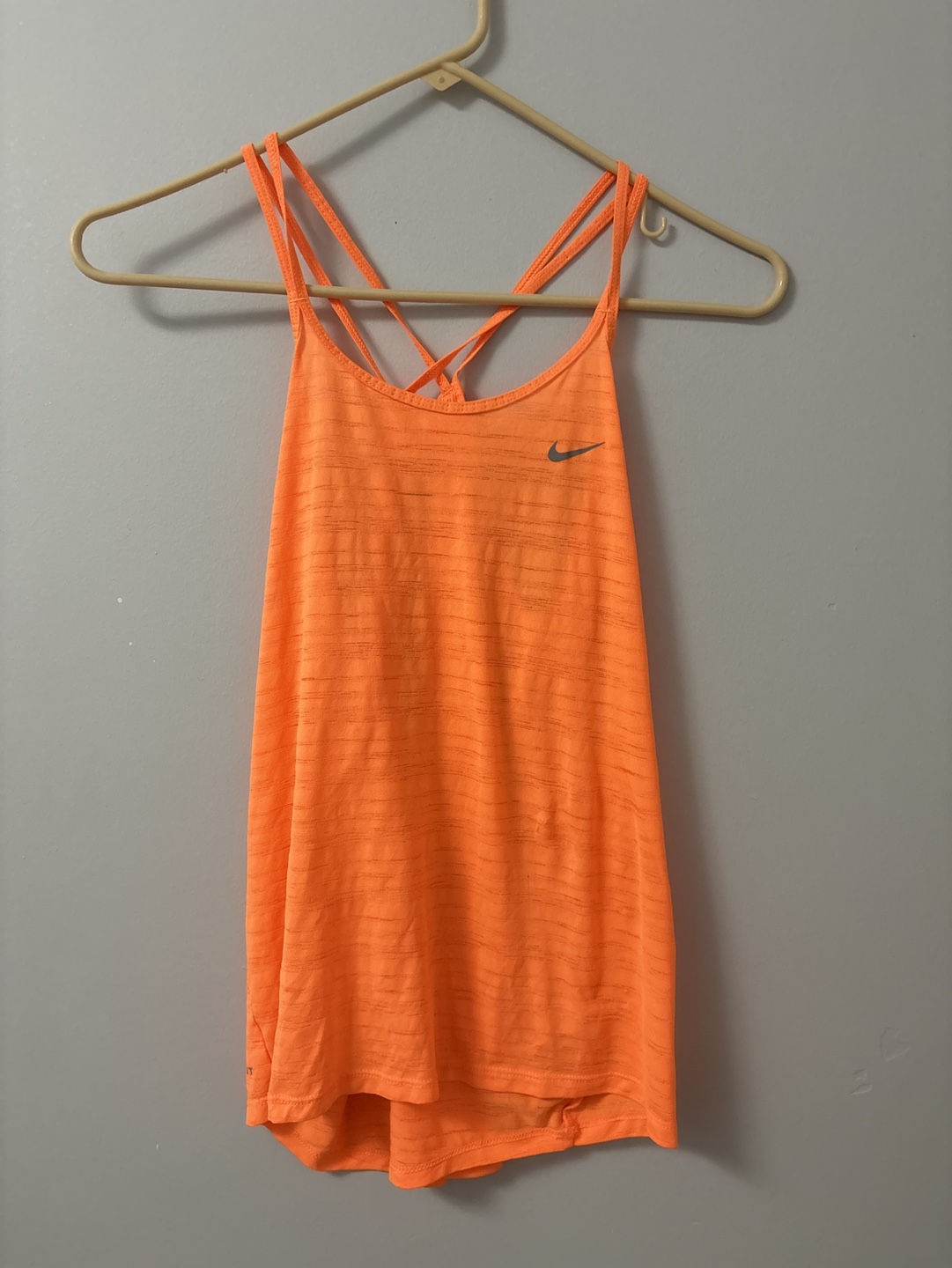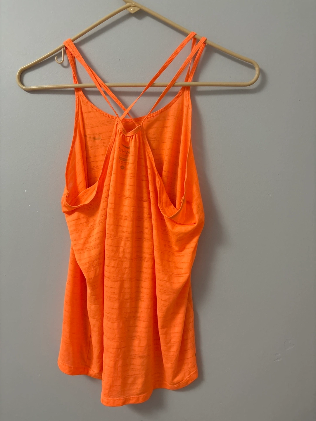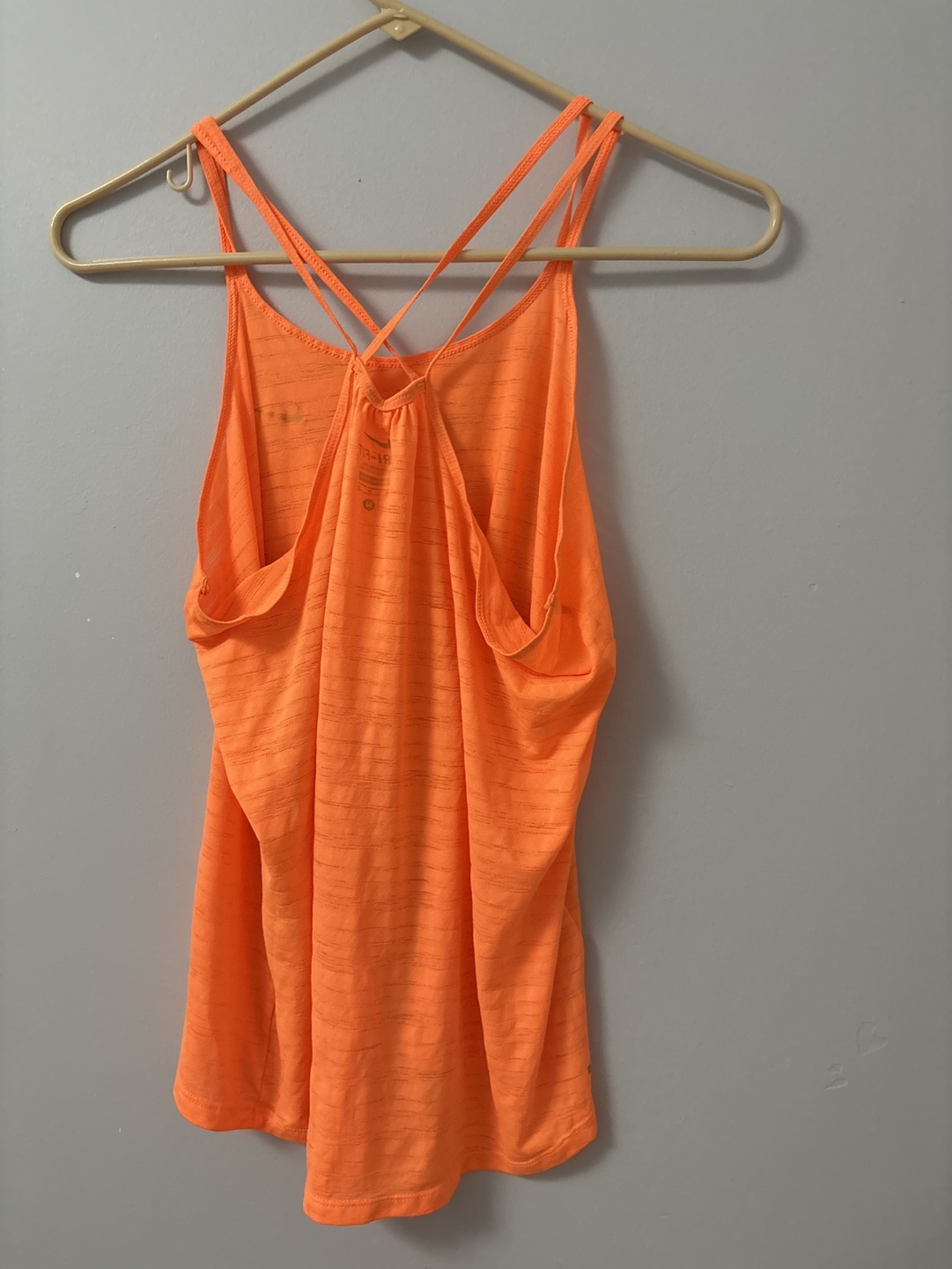 Bright orange athletic tank top. Criss-cross straps in the back. Lightweight and breathable material. Great for workouts or casual wear.