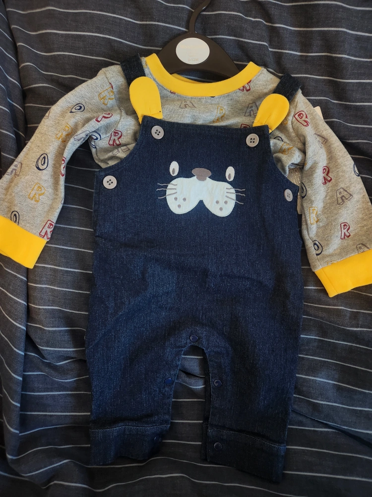 Adorable baby boy outfit. Features denim dungarees with cute embroidered dog face and a coordinating long-sleeve top.