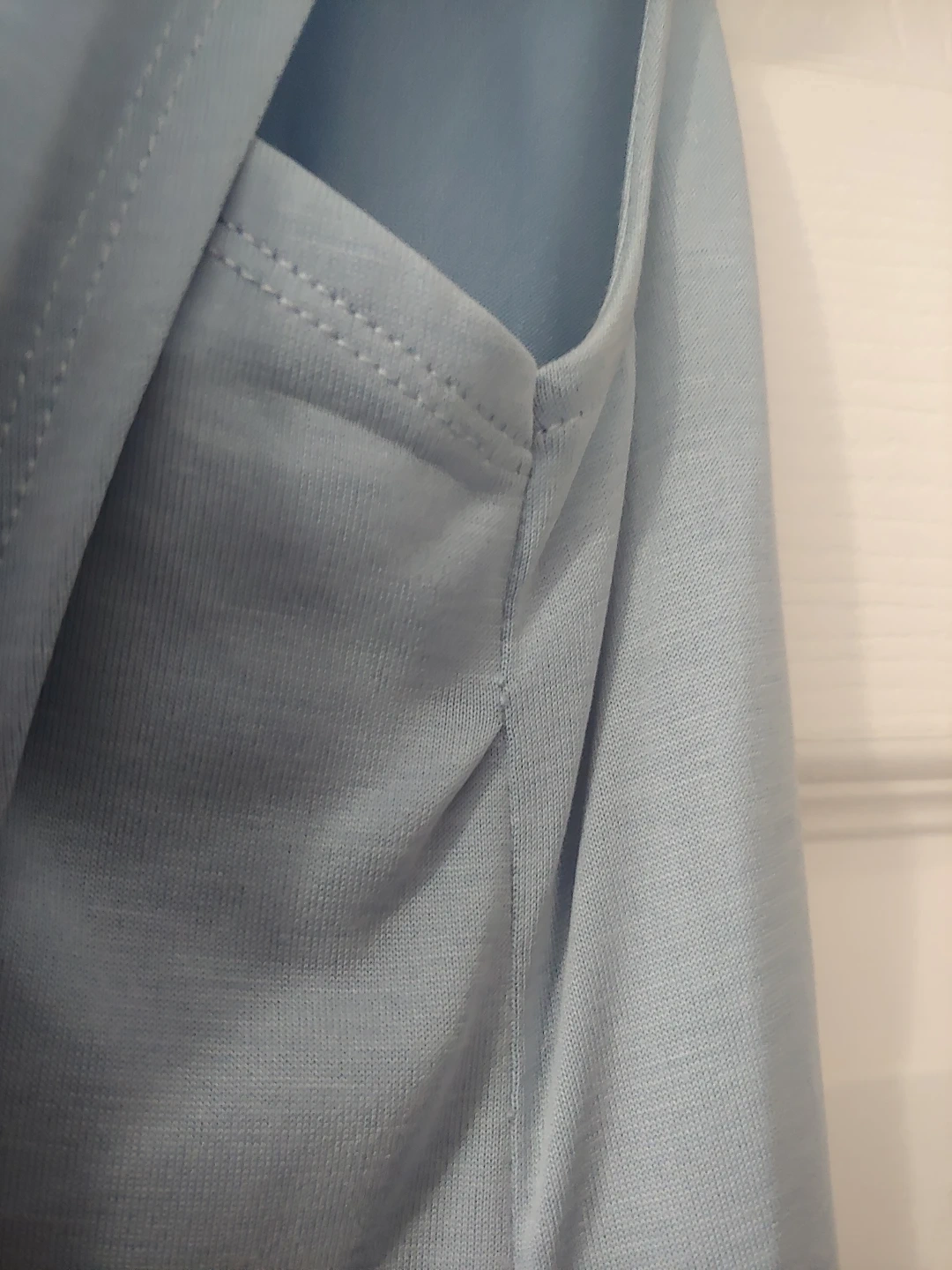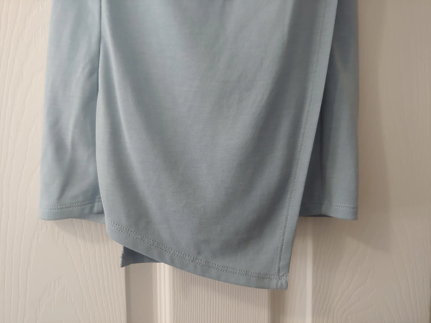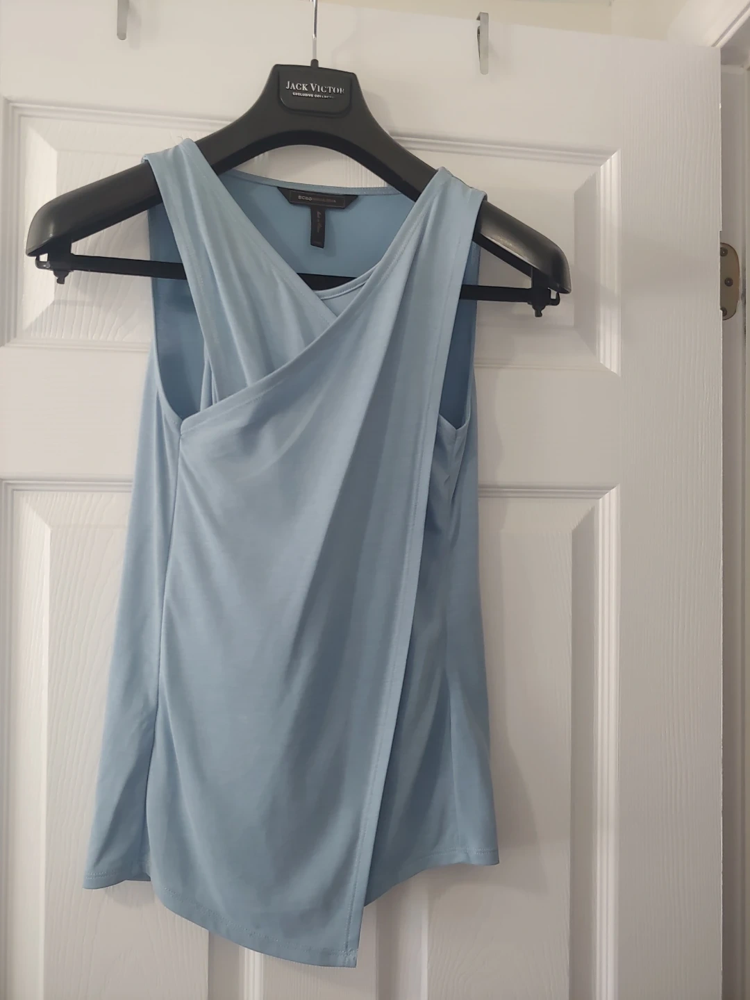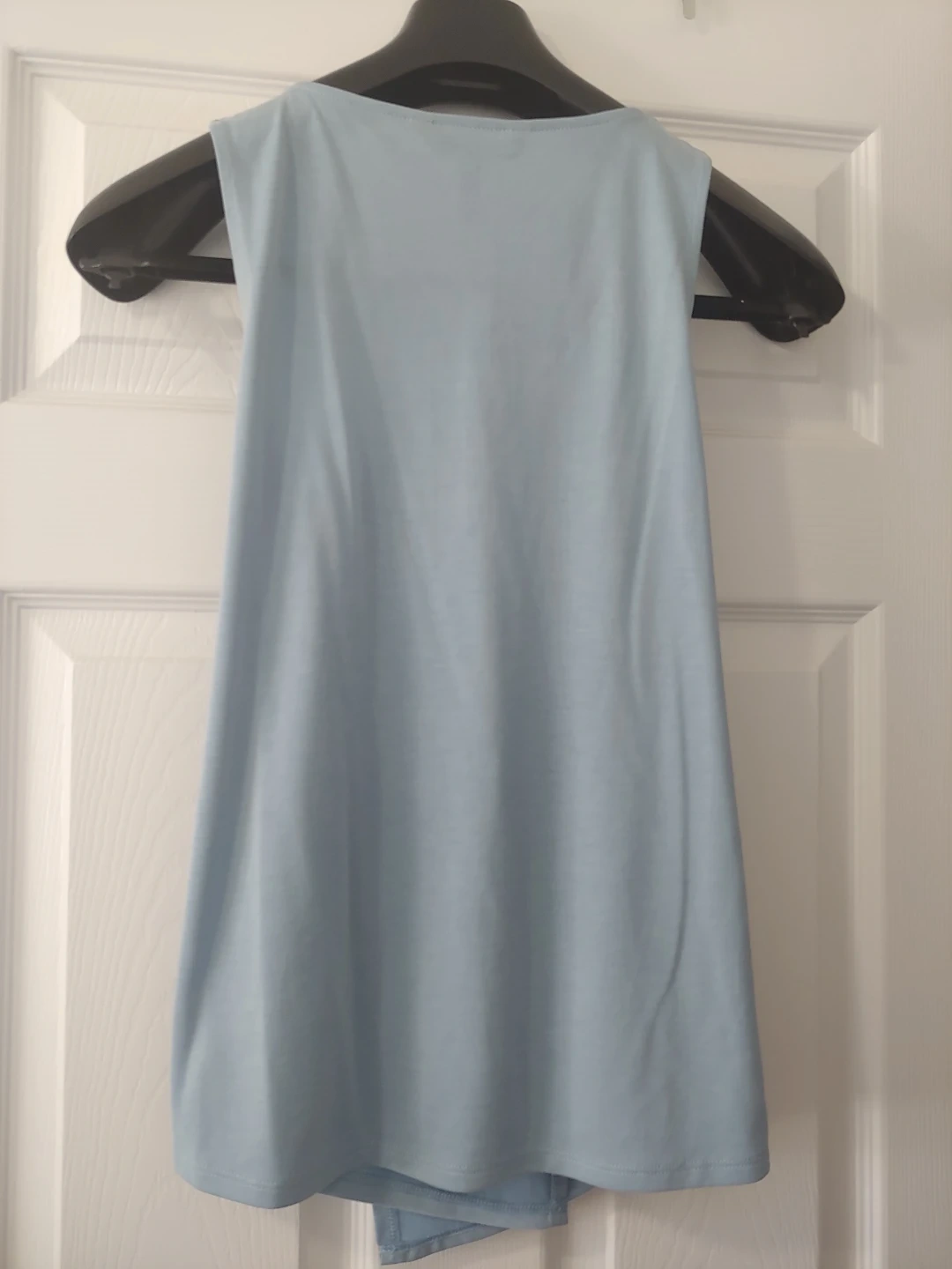 Beautiful and unique light blue sleeveless top. Criss Cross design. I had this tailored under the arm as it was too big there and the pic shows where it was sown. There is a faint spot (shown) but that is covered up when you wear it (shown in the last photo). also an orange line (see photo) not very noticeable but need to let you know. these are why it's heavily discounted otherwise it's in excellent condition. tailored but worn just once.