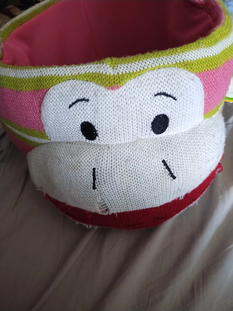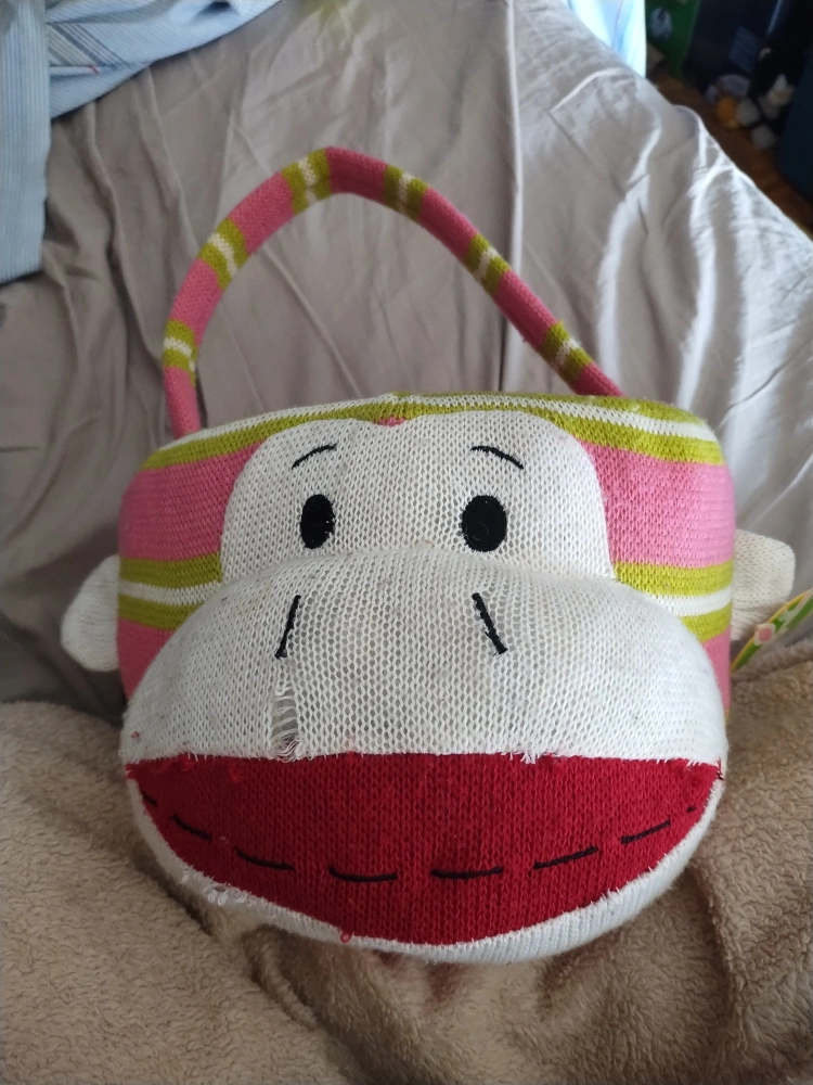 Adorable monkey-shaped basket for Easter. Pink, green, and white knit fabric. Small tears near the mouth. Perfect for Easter or everyday use.