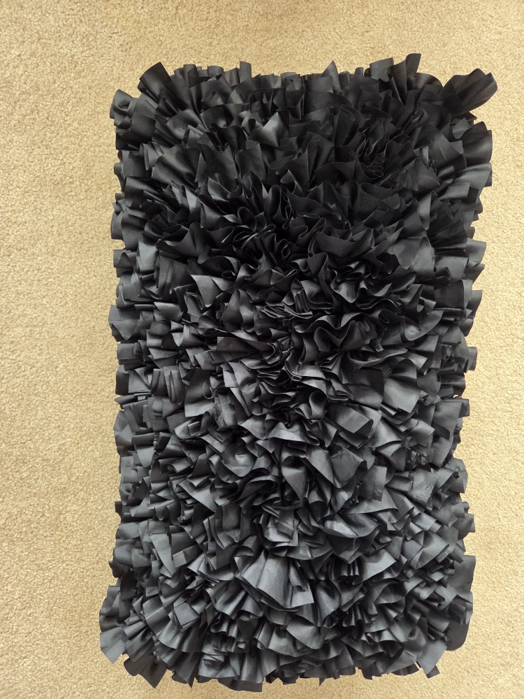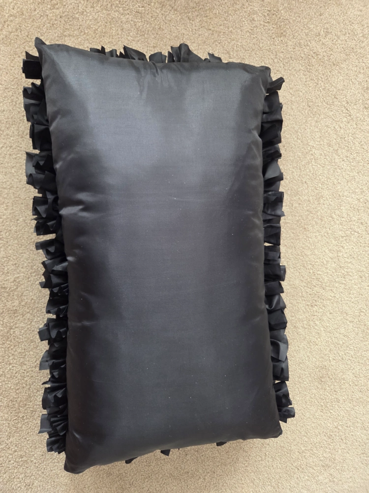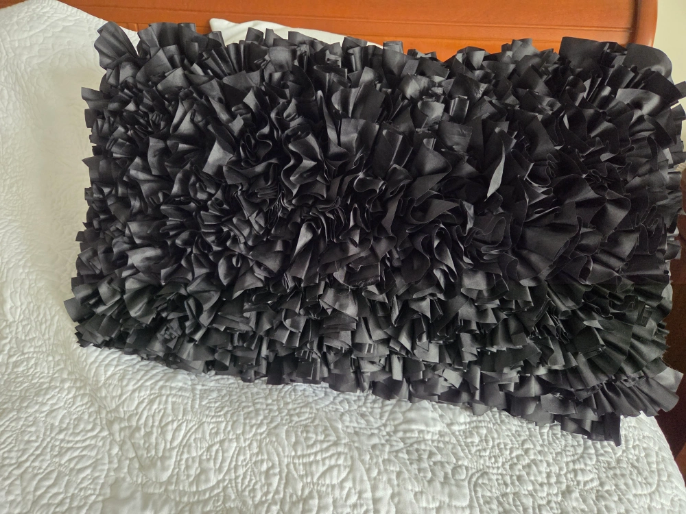 Black rectangular pillow. Fully covered in ruffles. Soft material. Great for adding a touch of elegance to your home décor.