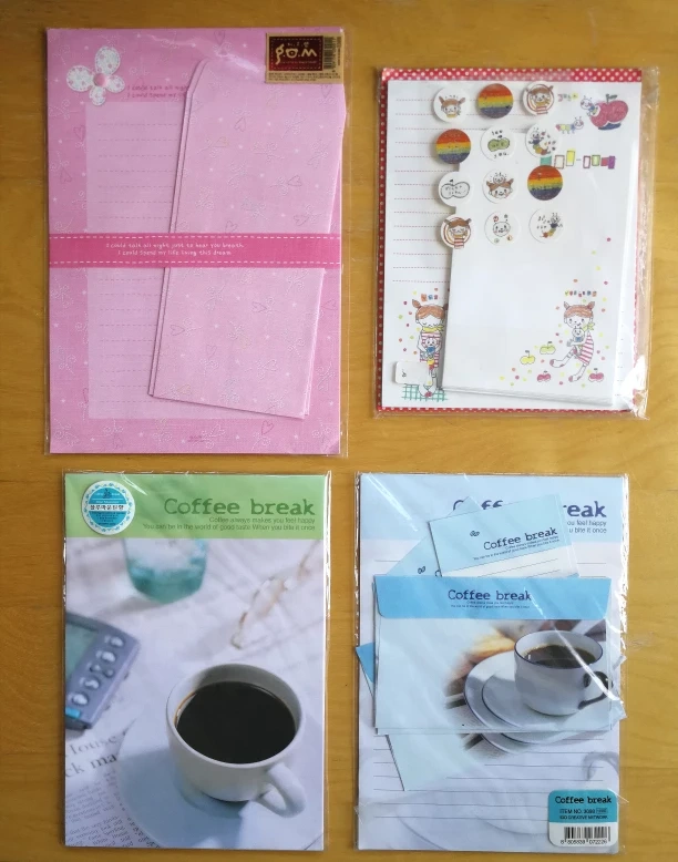 π Coffee Break themed set: 6 letter sheets, 3 envelopes and 3 note paper. Available in green and blue