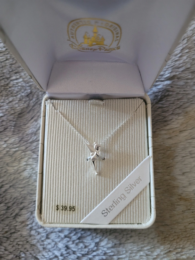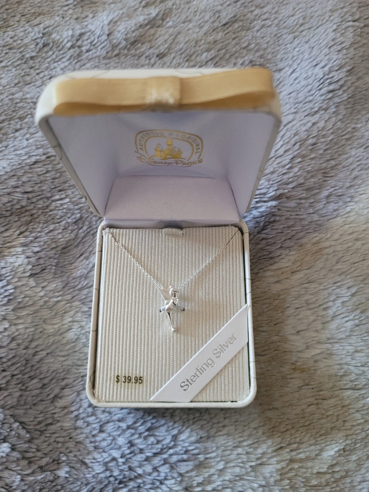STERLING SILVER. Original Disney Parks Tinkerbell charm with necklace. Comes in original box. New, never worn. Also has a lobster clasp for security as backing of necklace. Originally 40 USD, asking 30 CAD (canadian dollars)