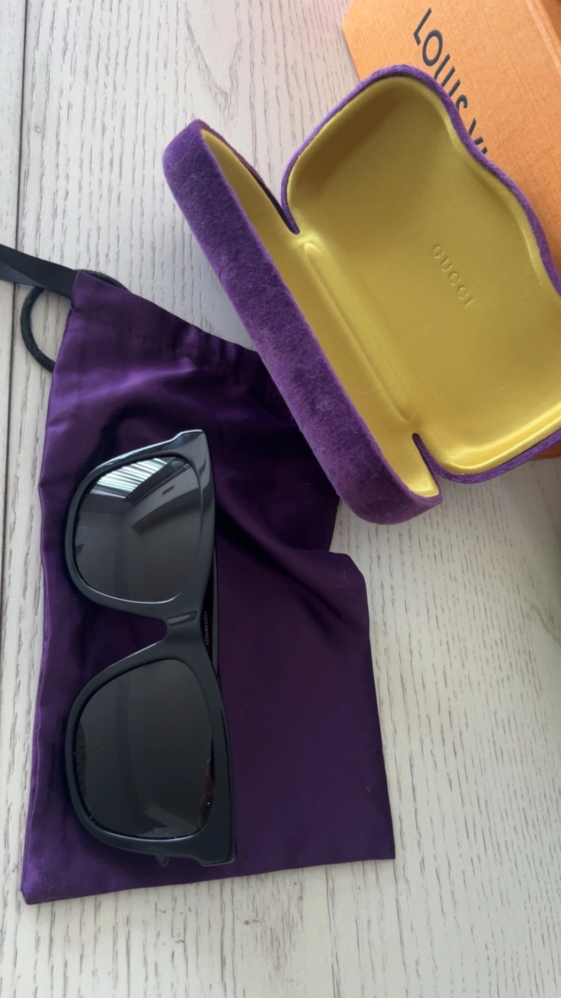Black square sunglasses. Red and black striped detailing. Comes with a purple soft cloth pouch and a yellow and purple hard case. Excellent condition.
