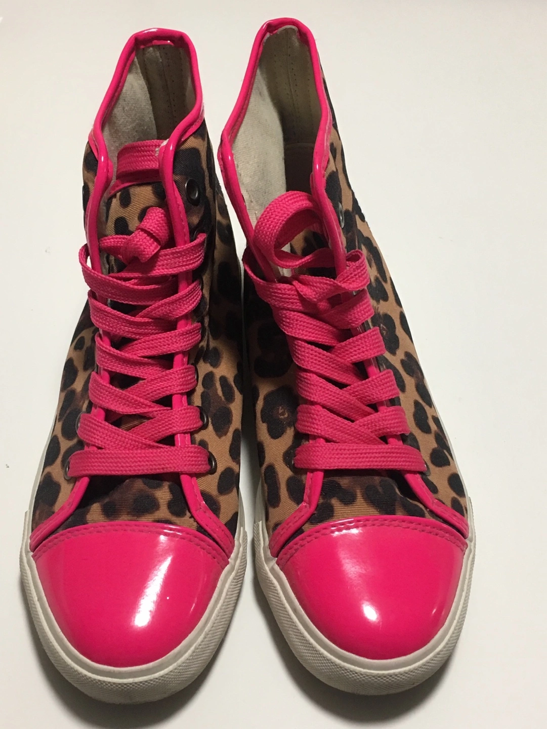 147Cute leopard print high top sneakers. Pink accents. Pink laces. Great for casual wear.