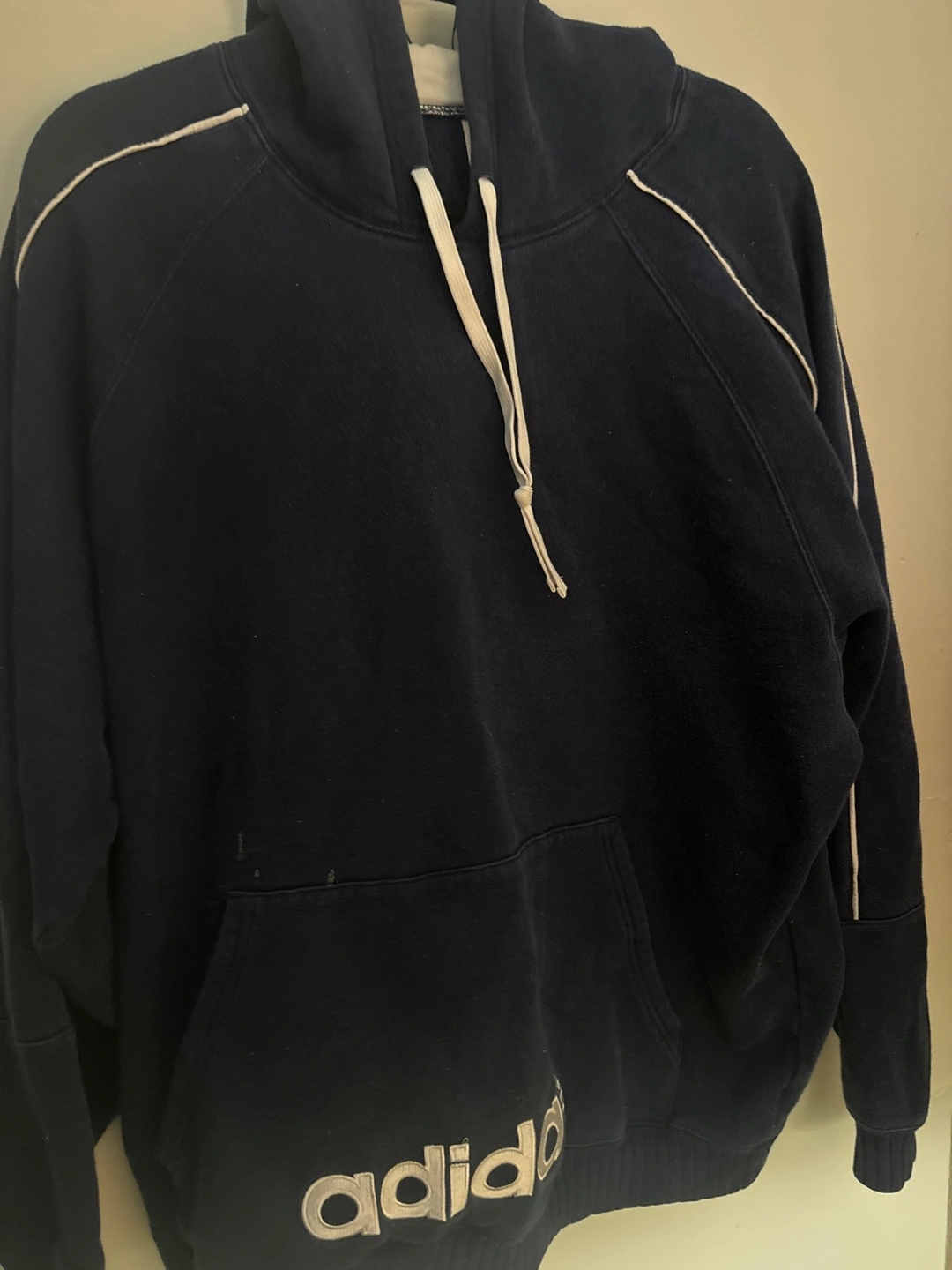 Men's navy blue Adidas hoodie. Features white piping detail along the sleeves and kangaroo pocket. Classic Adidas logo on the bottom. Good condition.