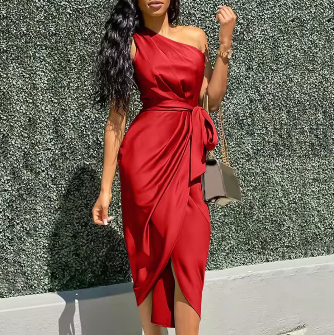 Stunning red midi dress. One-shoulder design. Features a wrap-style skirt and a self-tie belt. Elegant and stylish. Satiny material. Perfect for a special occasion.