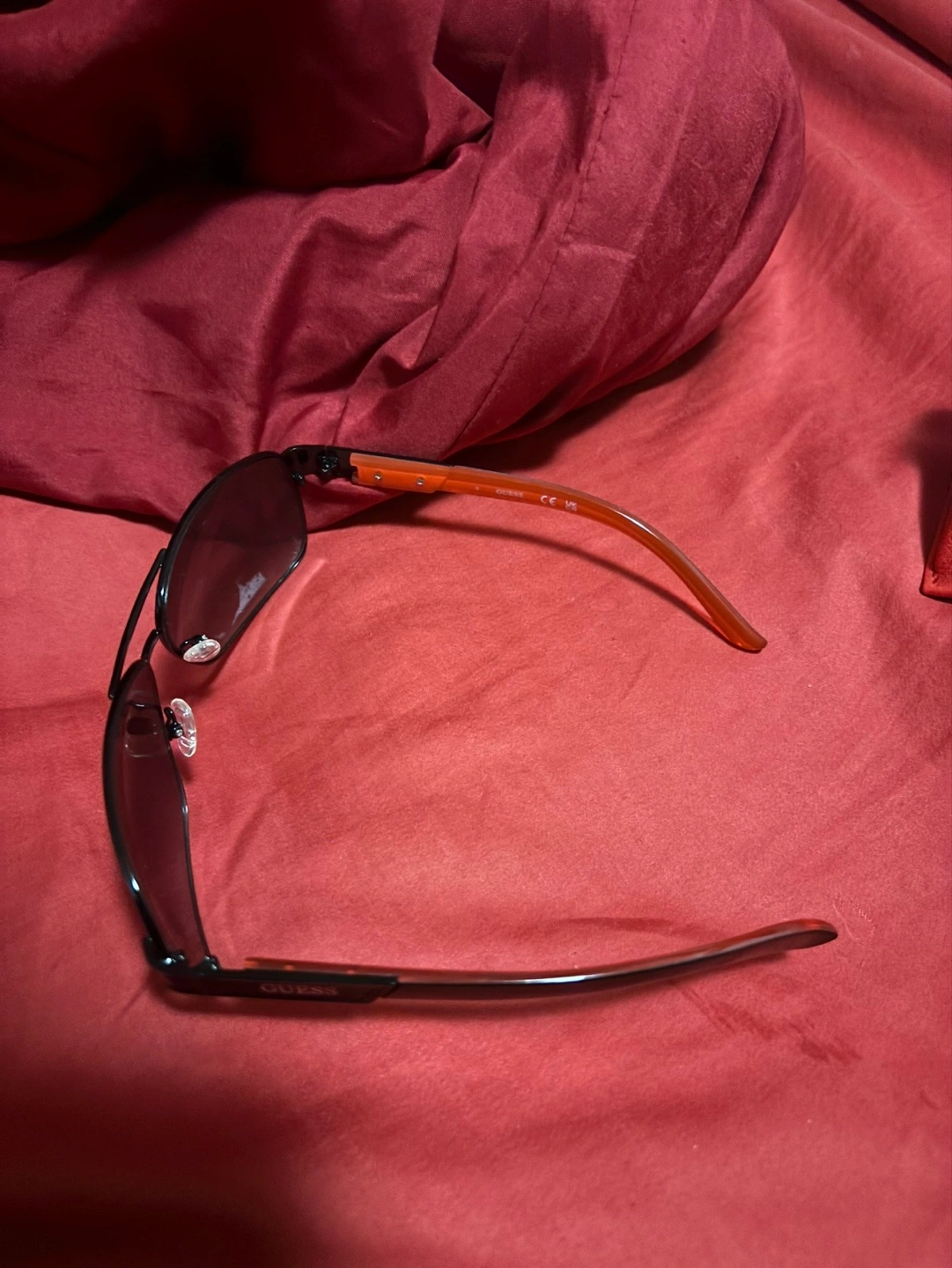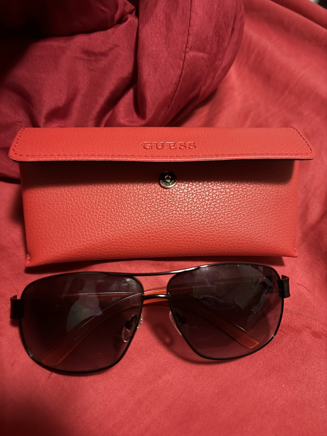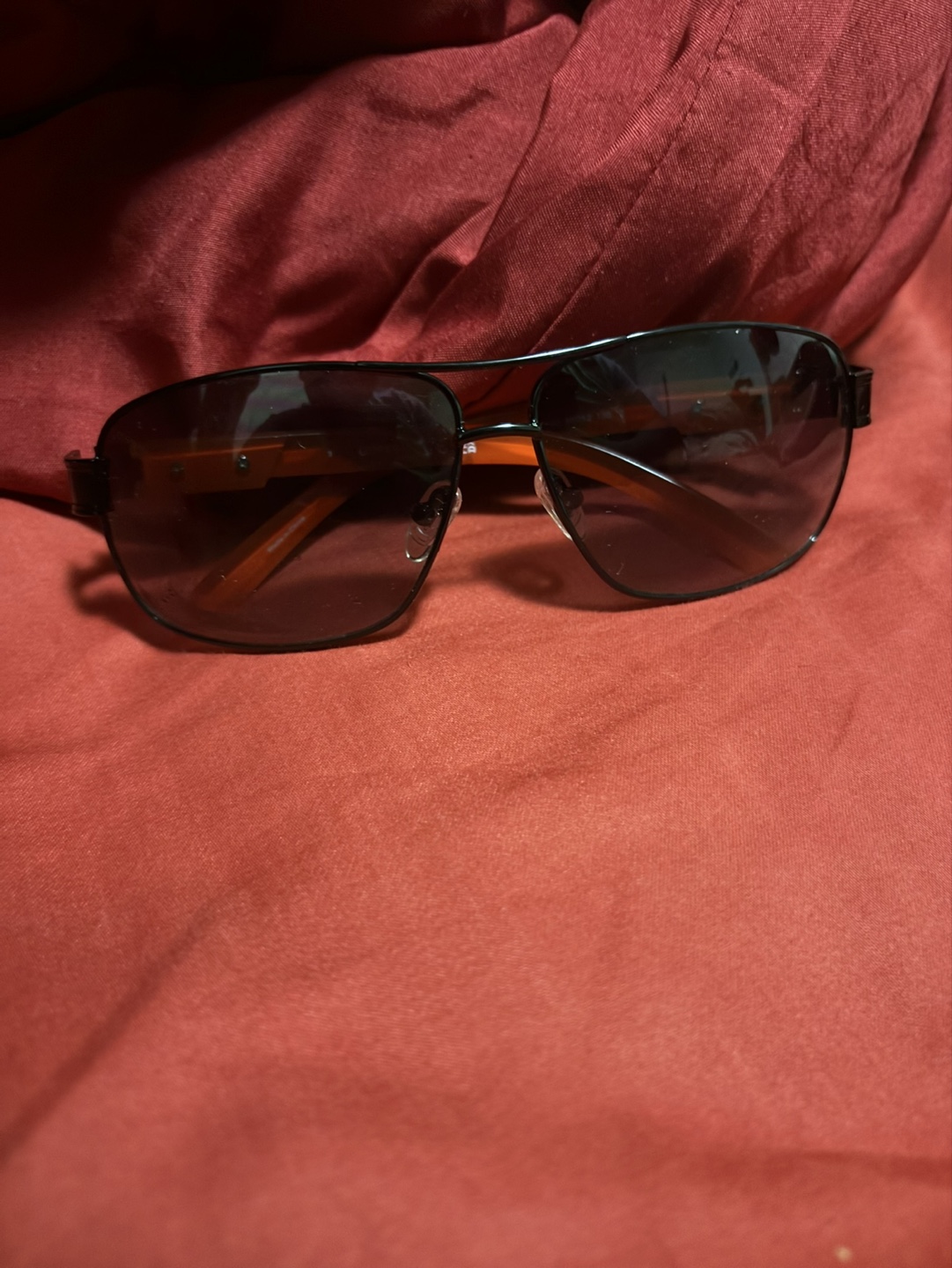 Men's aviator sunglasses. Black metal frame, dark grey lenses. Includes a red hard case. Excellent condition. (OPEN FOR OFFERS