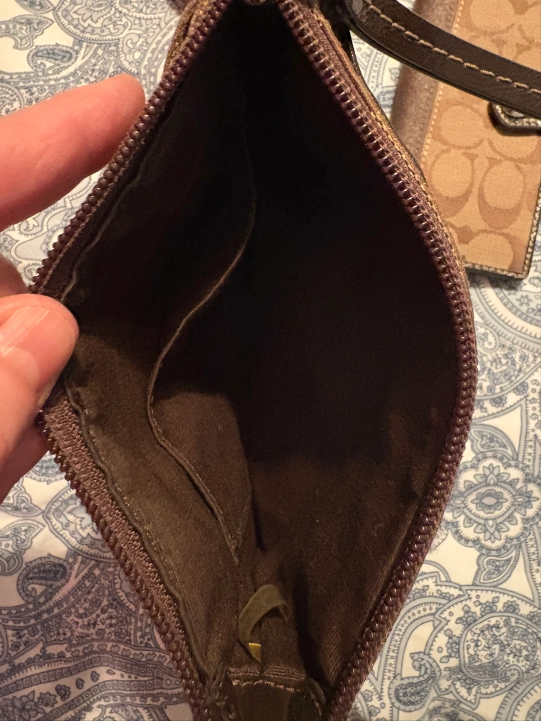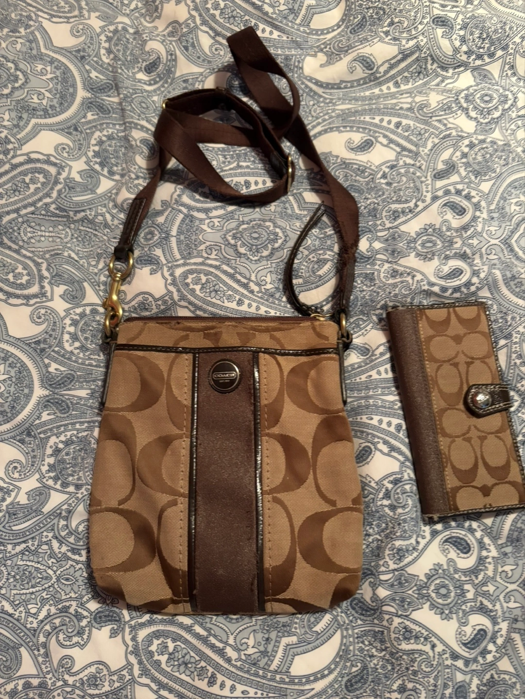 Brown Coach crossbody bag and matching wallet. Both feature the signature Coach pattern. Crossbody bag has an adjustable strap. Wallet has multiple card slots and a clear ID window. Used, shows some wear.