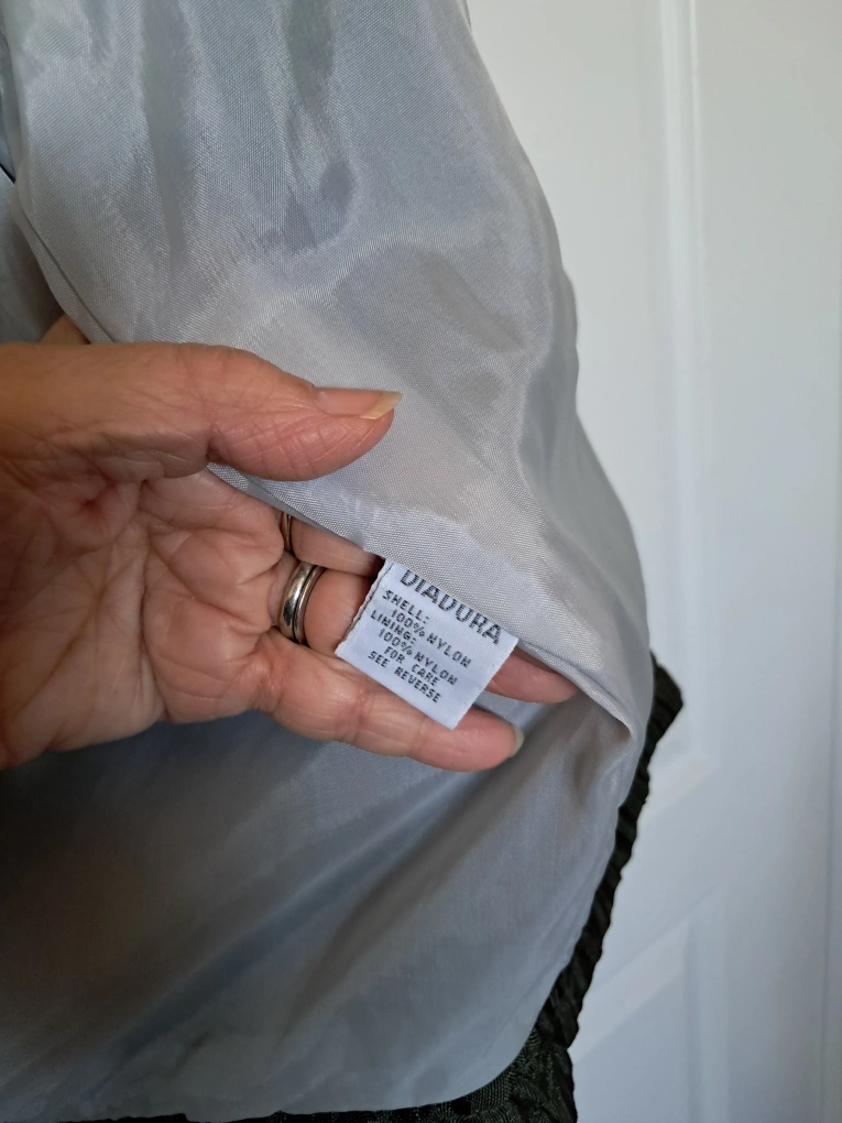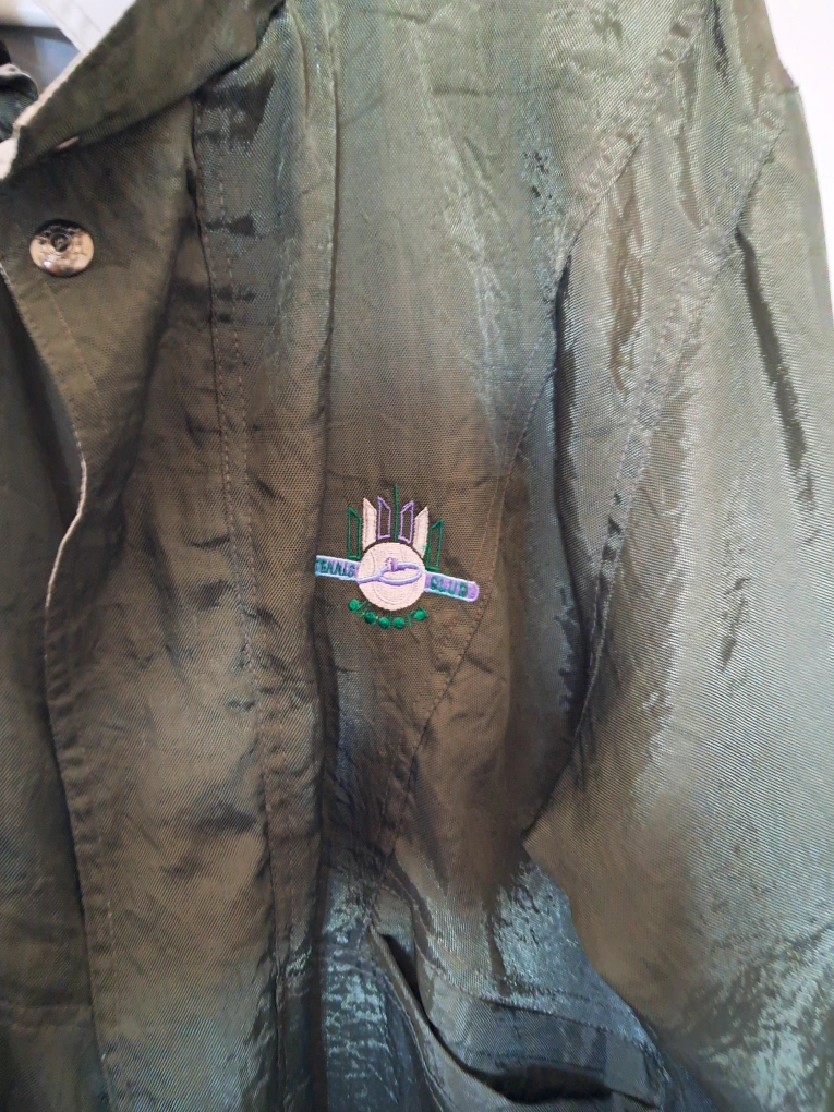 Green vintage Diadora jacket. Size 48. Features a grey interior and embroidered Tennis Club logo. Snap and zipper closure. Long sleeves with elasticized cuffs. Good condition.