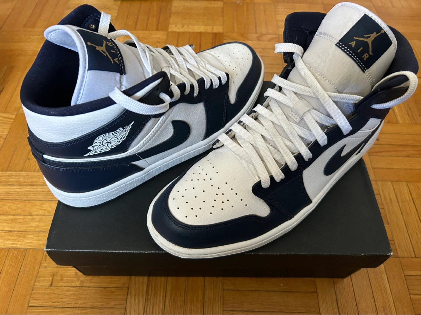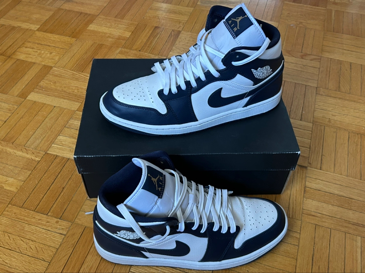Pair of Air Jordan 1 Mid sneakers. Obsidian and white colourway. Mid-top style. Classic shoe in great condition paid around $200 inc tax when new if I remember right. No scratches or cuts or snags in stitching, loads of tread on the soul. I’ve worn them twice on two nights out, other then that they been kept in the box. I need to buy a car for work so it’s time for them to go. From a pet free and smoke free home.