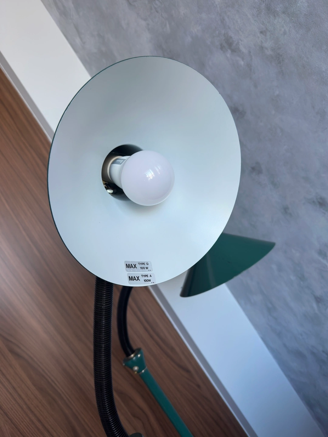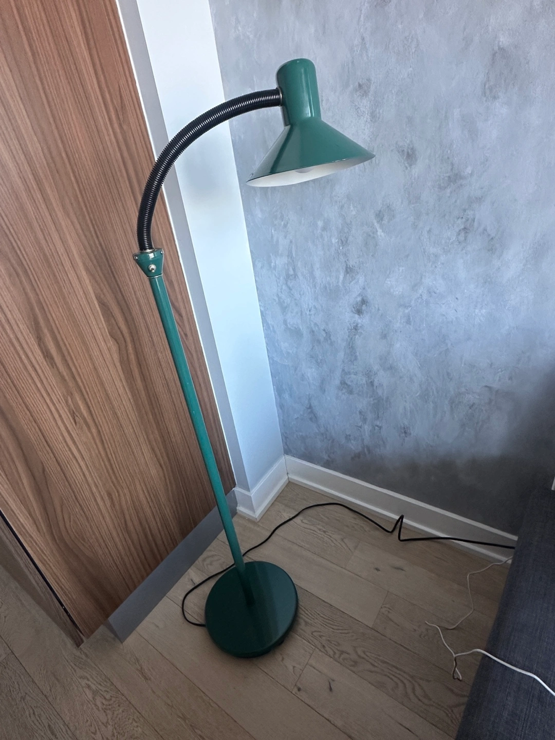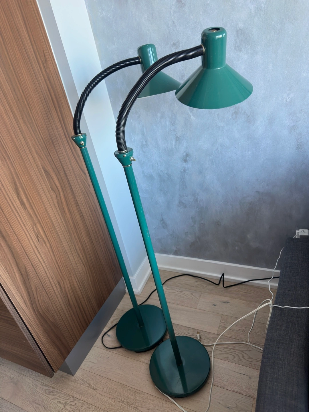 Set of two vintage green floor lamps with 2 Govee smart bulbs included. Flexible gooseneck design. Dark green metal finish. Simple, stylish, and functional.