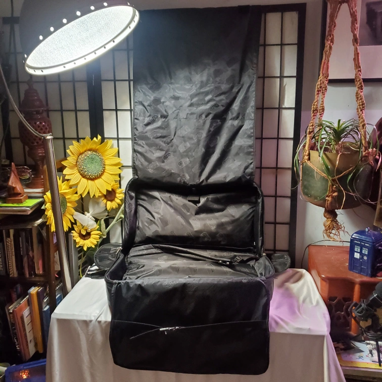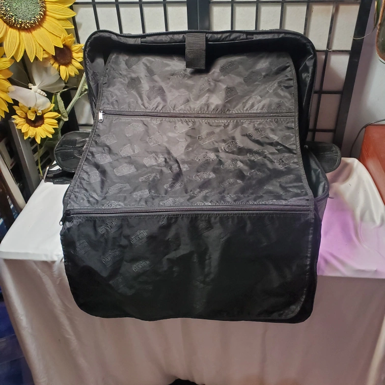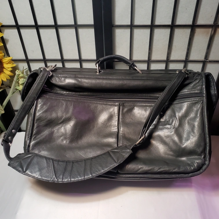 ĺ l Black Leather Travel Bag is a medium-sized weekend bag that opens up to a spacious 30.5 inches in width. Made of leather with a fabric lining, it features a solid black color with a top handle for easy carrying.
