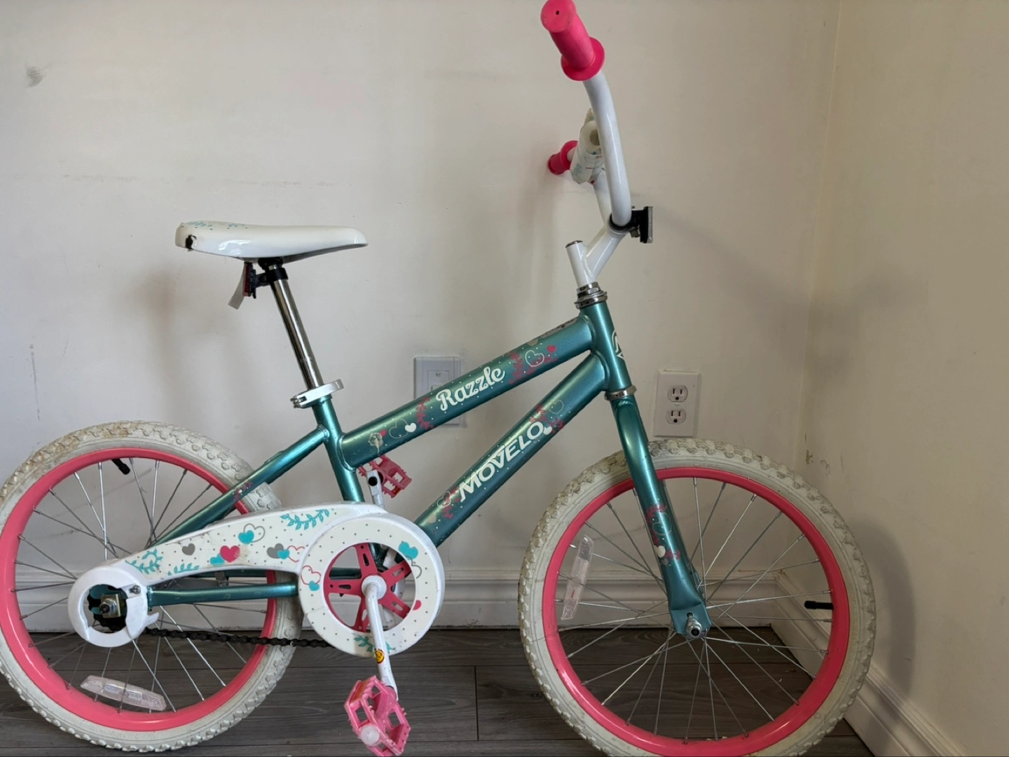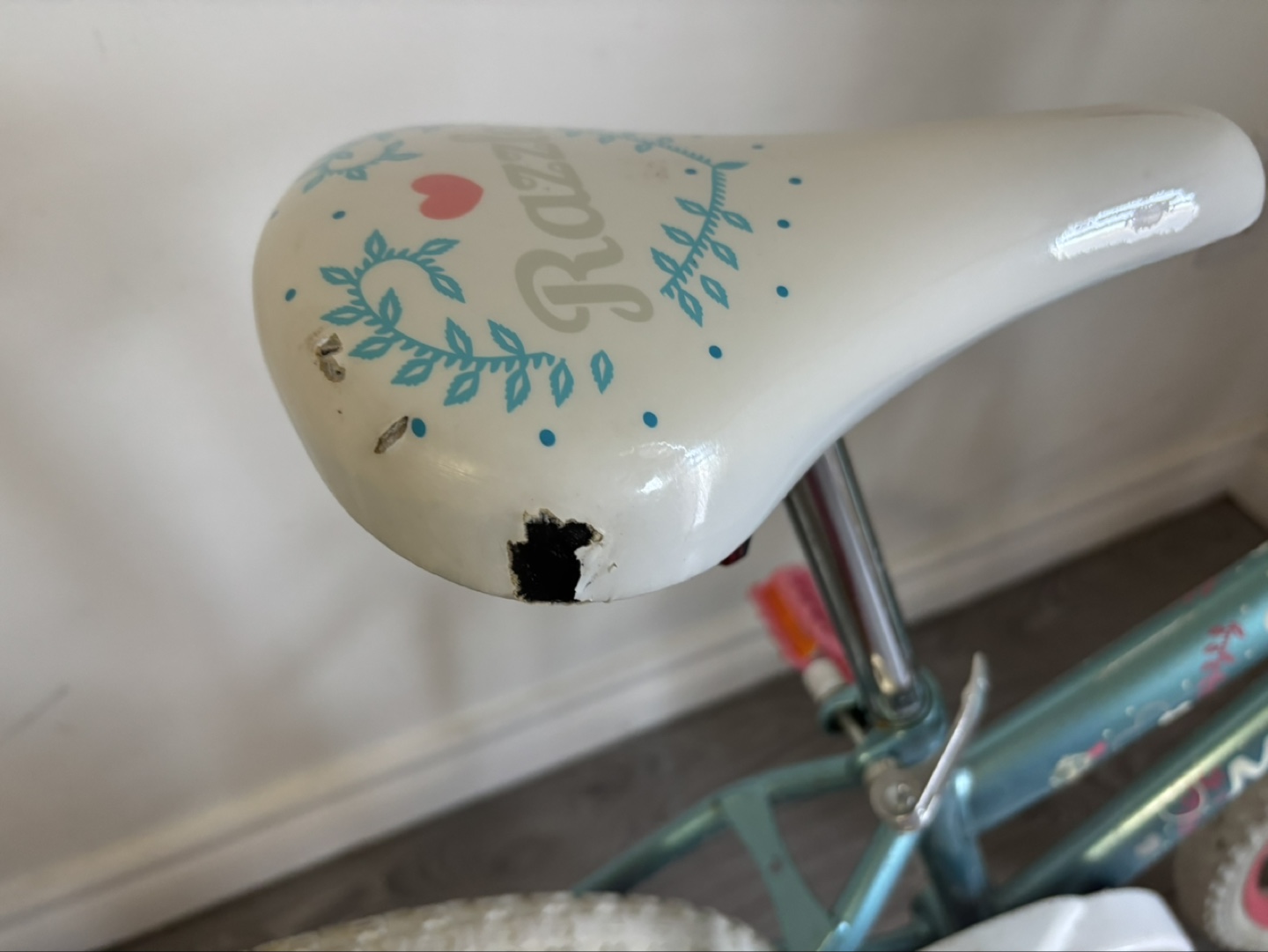 Pre-owned girls' bicycle. Teal frame, pink accents. Some wear and tear on the seat. 16-inch wheels. Ready for a new rider!