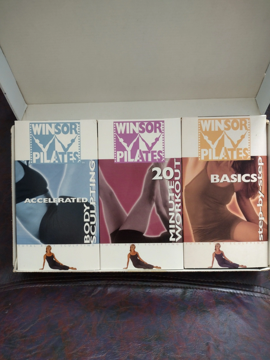 Vintage Windsor Pilates workout VHS tapes. Includes three tapes: Accelerated, 20 Minute Workout, and Basics. Also includes additional pamphlets and a sculpting journal. Box shows some wear.