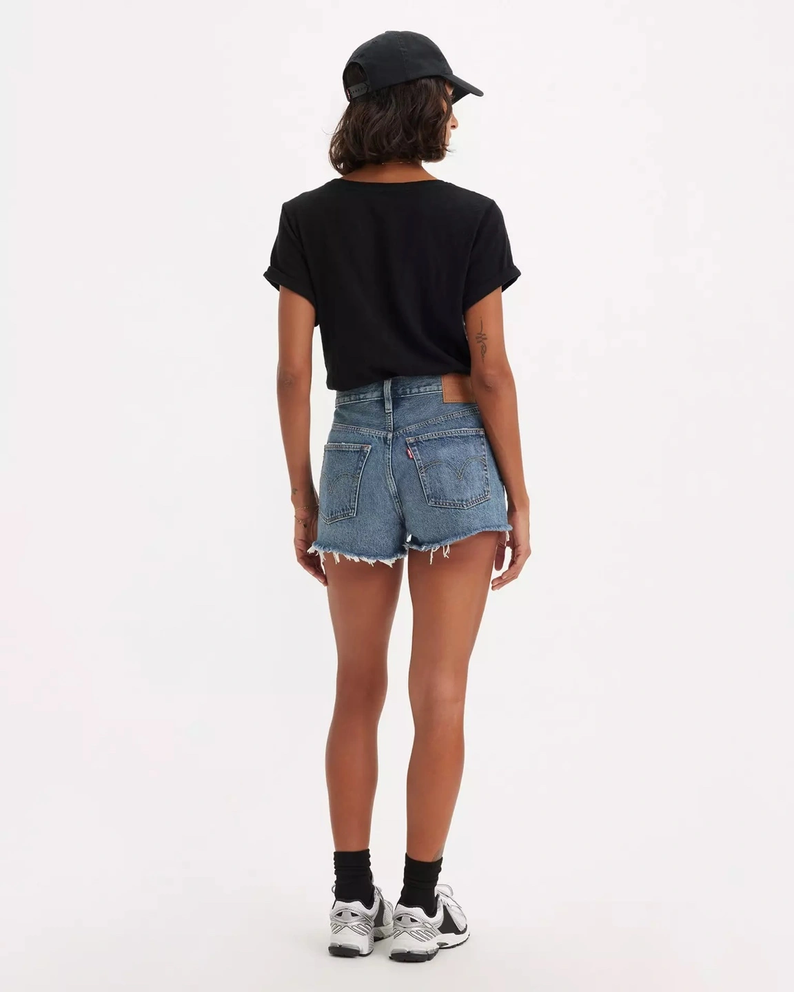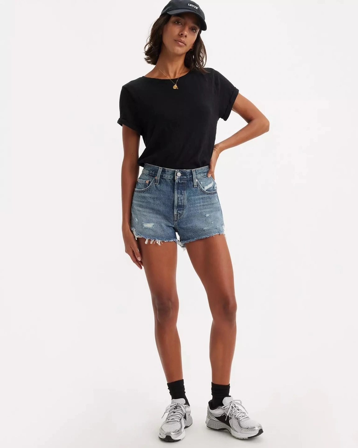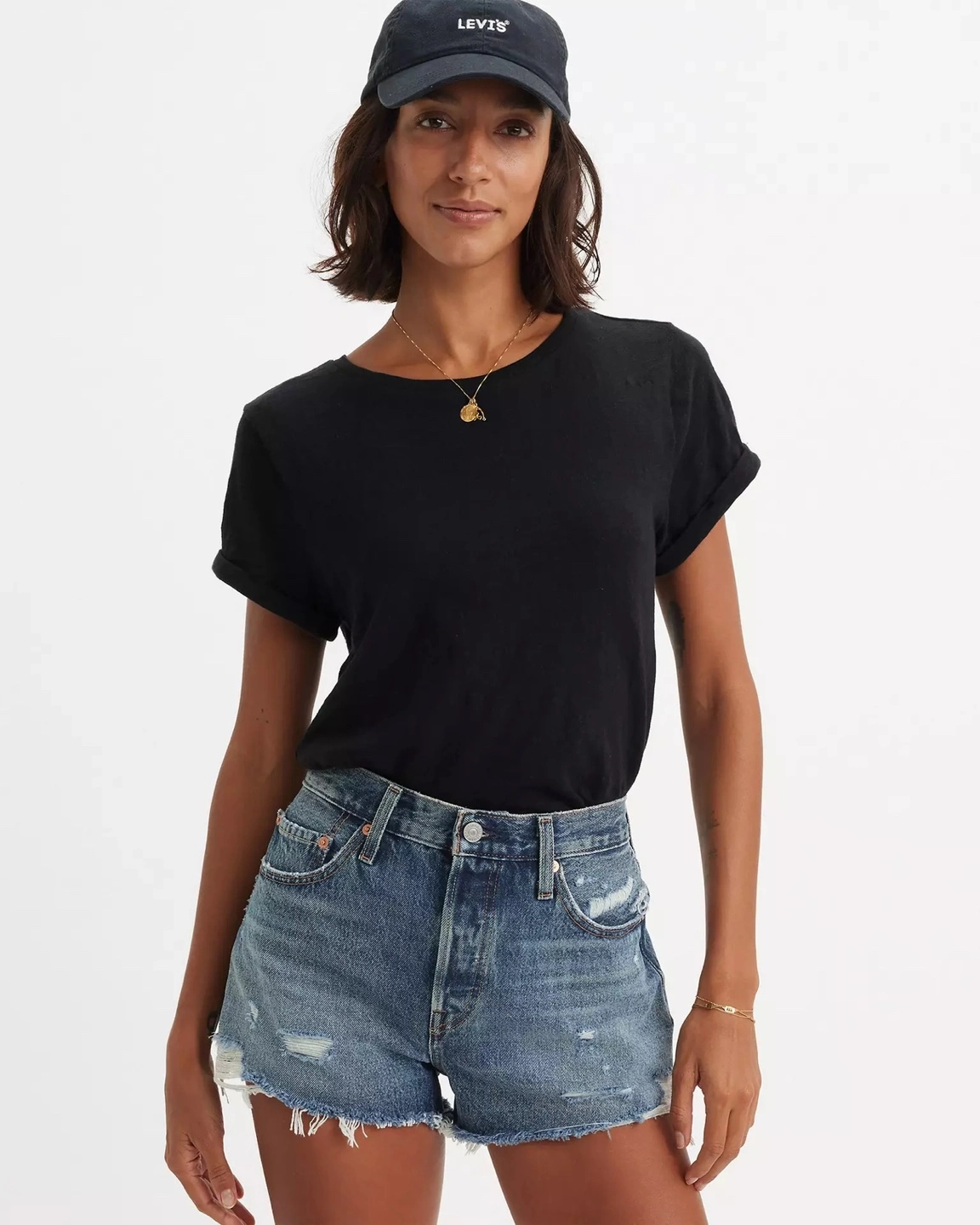 15Distressed denim shorts. High-waisted, light wash. Frayed hems. Classic 501 style.